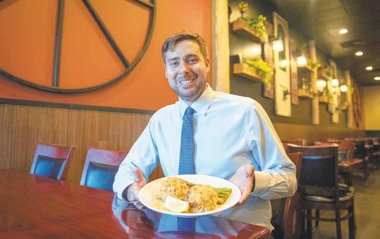 Owner Hathan Clark poses for a portrait with Fratelli’s Italian & Seafood’s signature dish, the crab cakes, at the restaurant on Aug. 4.