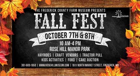 Farmer ChuckBone’s Pumpkin PatchFall Festivals — 10 a.m. to 6 p.m. at Farmer ChuckBone’s Pumpkin Patch, 6269 Ed Crone Lane, Frederick. Pick-Your-Own Pumpkins, Hayrides, Petting Zoo, Nature Trail, Hay Pyramid, Mulch Tunnels, Giant Chair, Kountry Music Maker, Bone Digging Area, Antique Tractor Displays, photo opportunities, food trucks, Air Cannons and more.