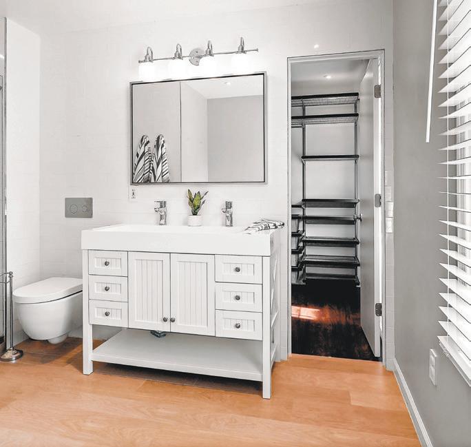 Upstairs, the primary suite is spacious and the ensuite bathroom has recently been renovated with a seamless glass shower door, custom closet system and new vanity.