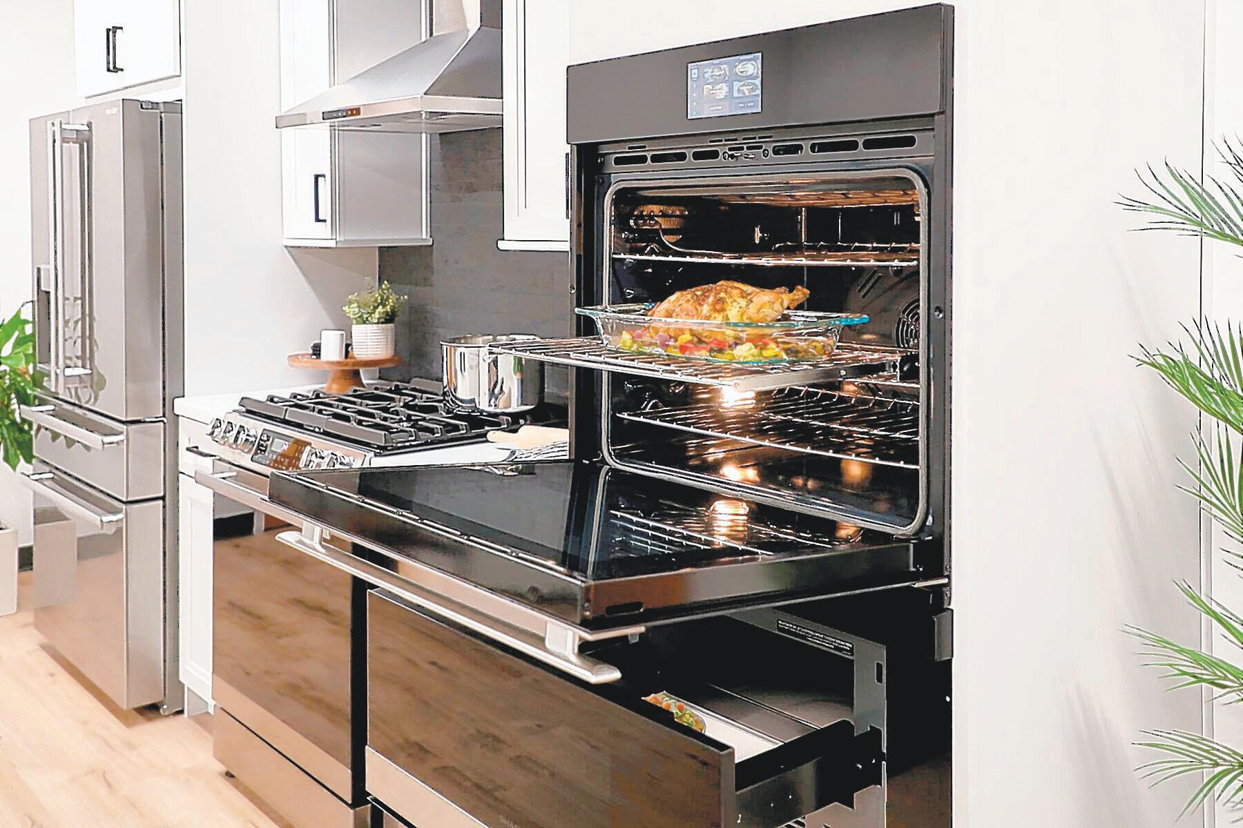 (1) Ovens: With a smart oven, you may be able to limit the incidence of traditional kitchen snafus. For example, the Sharp Smart Convection Wall Oven with Microwave Drawer Oven (SWB3085HS), a combination appliance, features a single simple-to-use, full-color touchscreen control panel. It Works with Alexa to accept voice commands. (Alexa-compatible device sold separately.) You can turn the oven on and off hands-free, keeping the control panel clean. This model is an excellent example of what technological innovation can bring to home cooking—allowing you to choose settings based on popular foods and recipes and giving you the ability to save up to 30 of your favorite menu items and cook times for easier access. Whether you’re a seasoned chef or just starting your culinary journey, a highly functional smart oven can be a game changer in your kitchen.