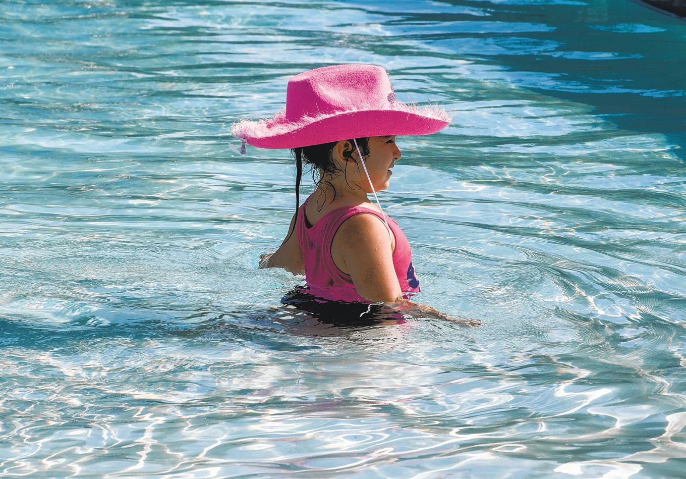 Angie Camtarero, 4, wears a hat while cooling off by the water at William R. Diggs Memorial Swimming Pool on July 5.