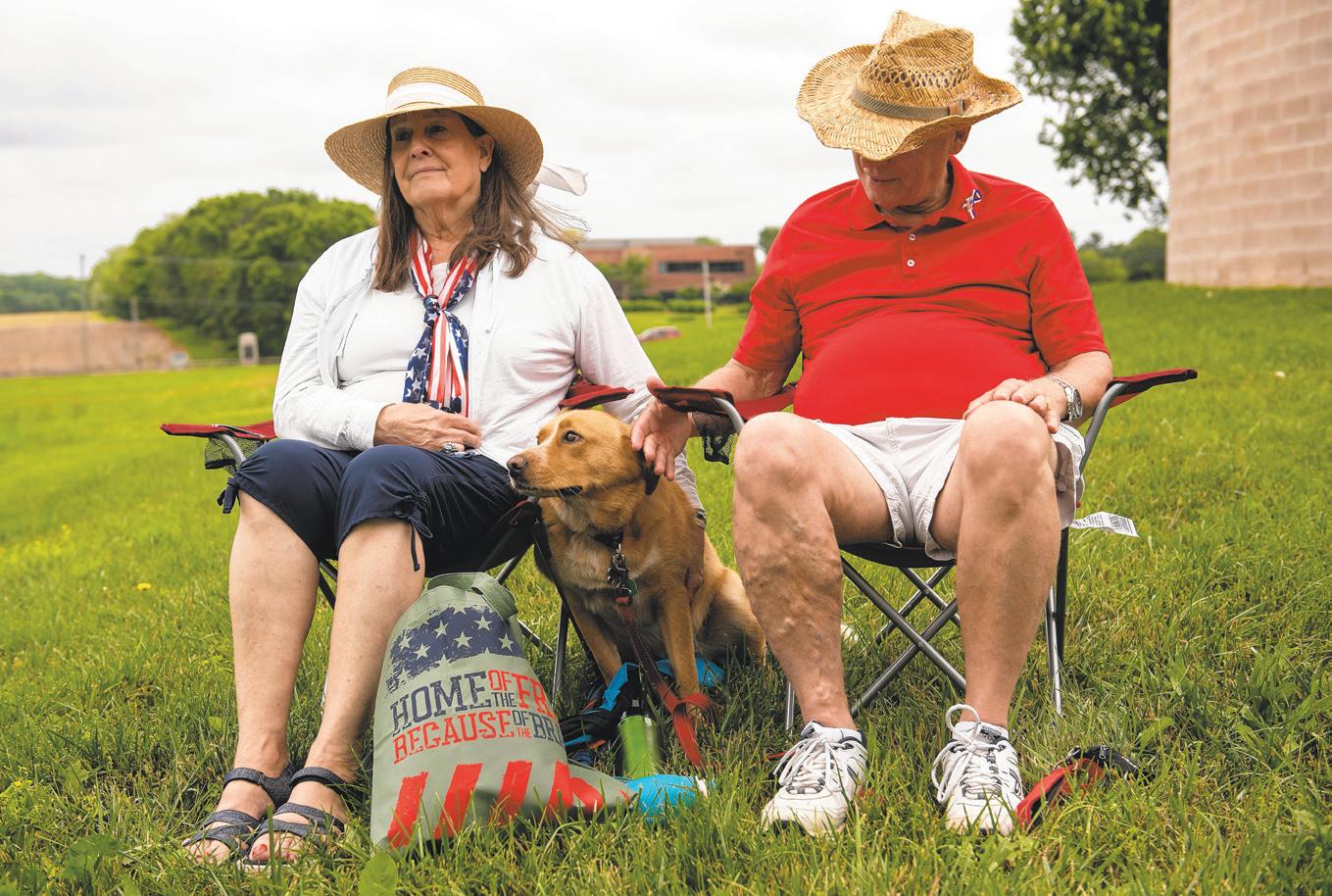 Sue Simmons, left, and Jon Simmons sit with their dog Callie as they watch a Memorial Day program held at Monocacy National Battlefield in May.