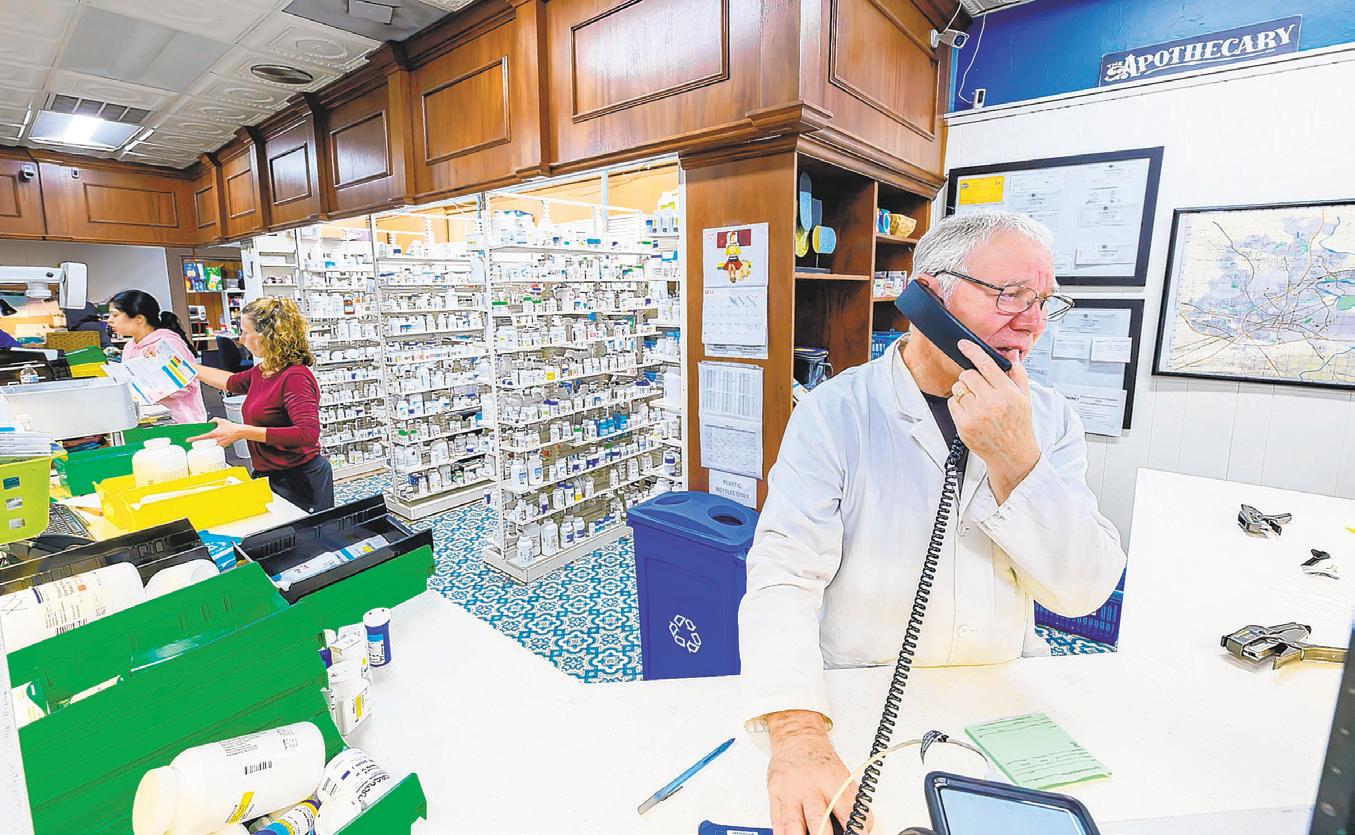 Stewart Carter, a pharmacist at Whitesell Pharmacy, talks to a customer on the phone.