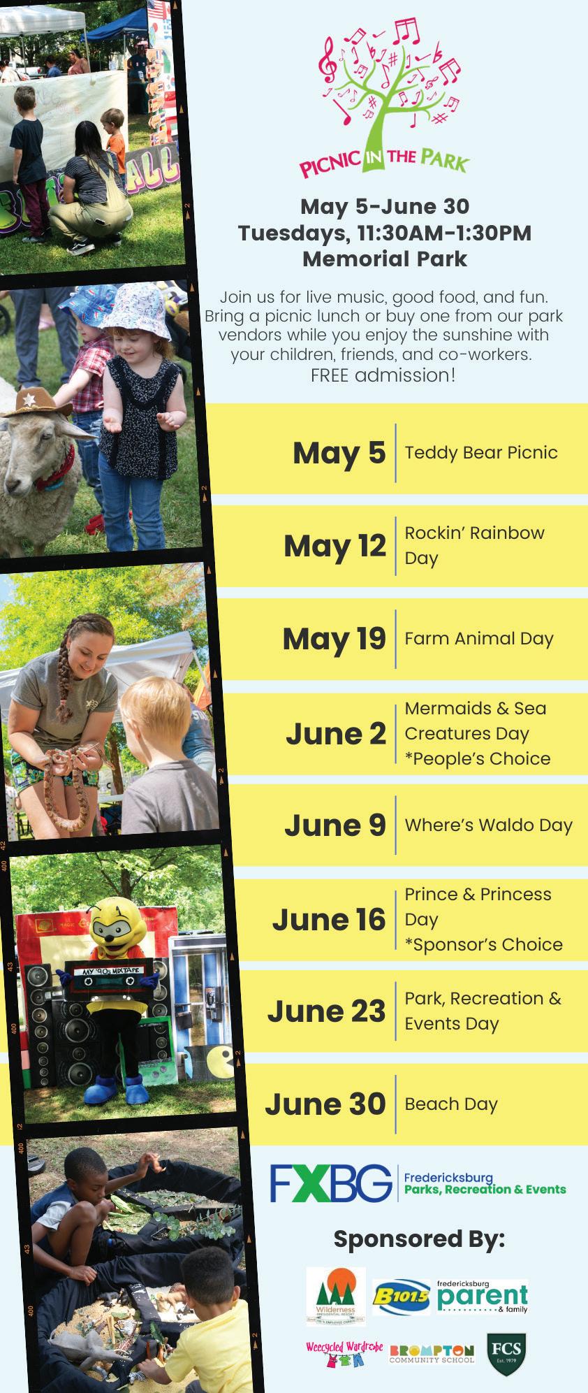 Picnic in the Park- 11:30am-1:30pm, Memorial Park, info: FXBGparks.com