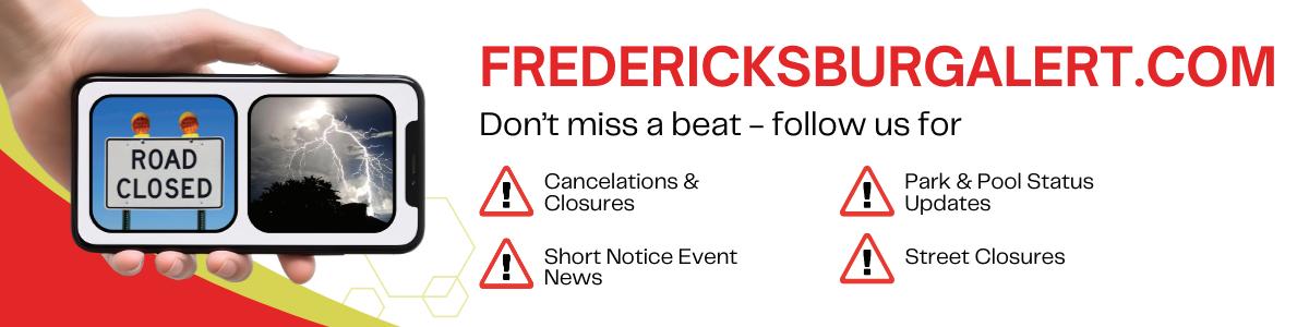 City-wide emergency notifications are also sent through the Fredericksburg Alert system. Create an account to receive updates by text or email, and be sure to review your preferences regularly.