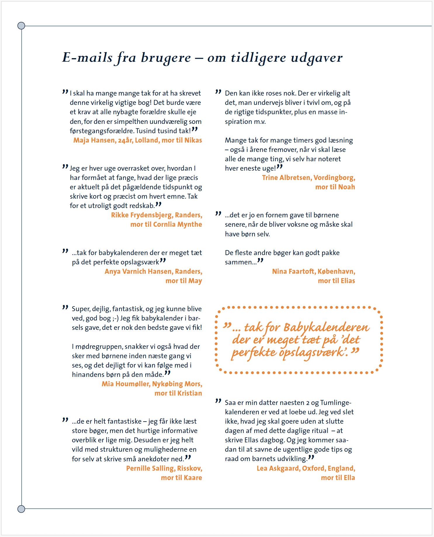 Babykalenderens store popularitet skyldes nok også, at bogens forfattere, Dorte og Karsten, har været i levende dialog med familierne allerede fra de første udgaver. Så bogen er hele tiden blevet forbedret og opdateret efter forældrenes input.