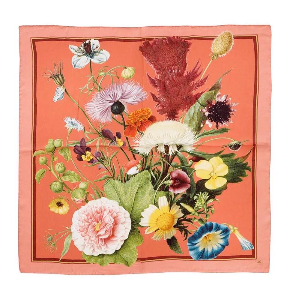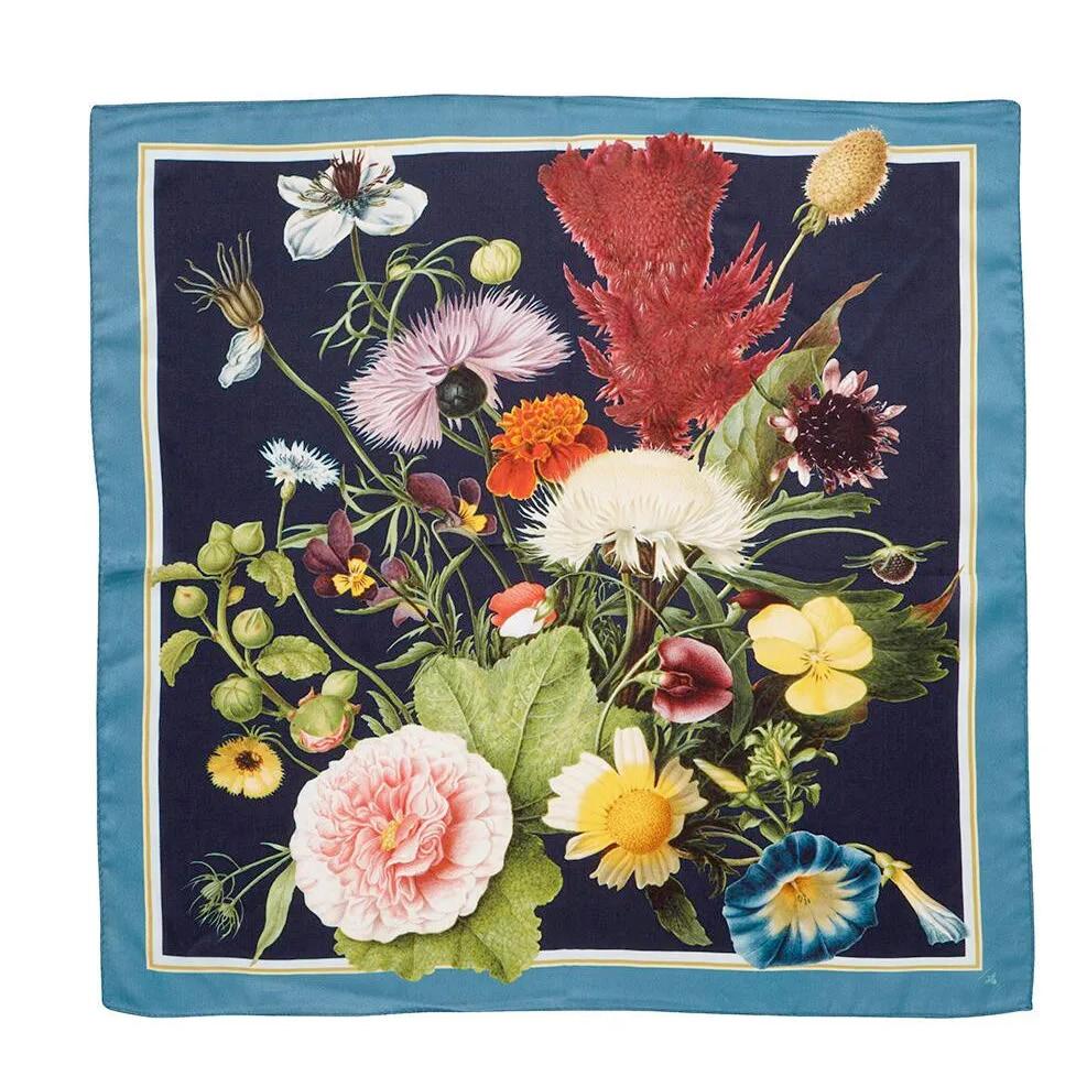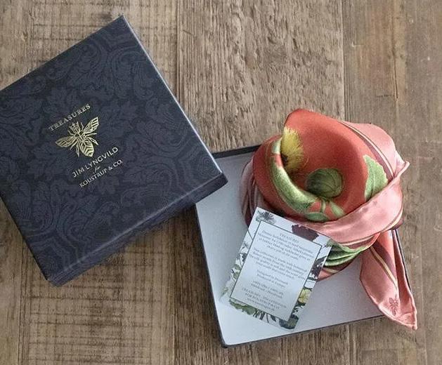 Smukt silketørklæde med blomster fra 1700-tallet i de flotteste farver. Silkekvaliteten er lækker blød, og tørklædet giver et ekstra pift til din påklædning. Silketørklædet er fra kolektionen TREAURES lavet i samarbejde med Jim Lyngvild.