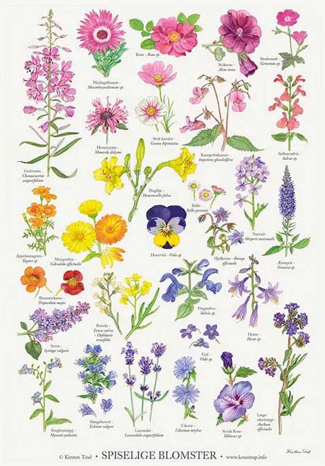 Smuk plakat med 30 blomster, du kan spise direkte fra naturen. Flot farvespil kombineret med interessant viden.