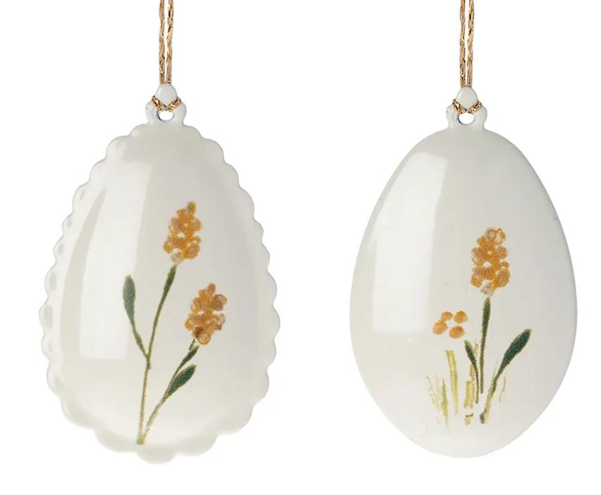 Påskeophæng i metal med håndmalede blomster fra Maileg. Måler ca. 6 cm uden snor. Pris pr. stk.