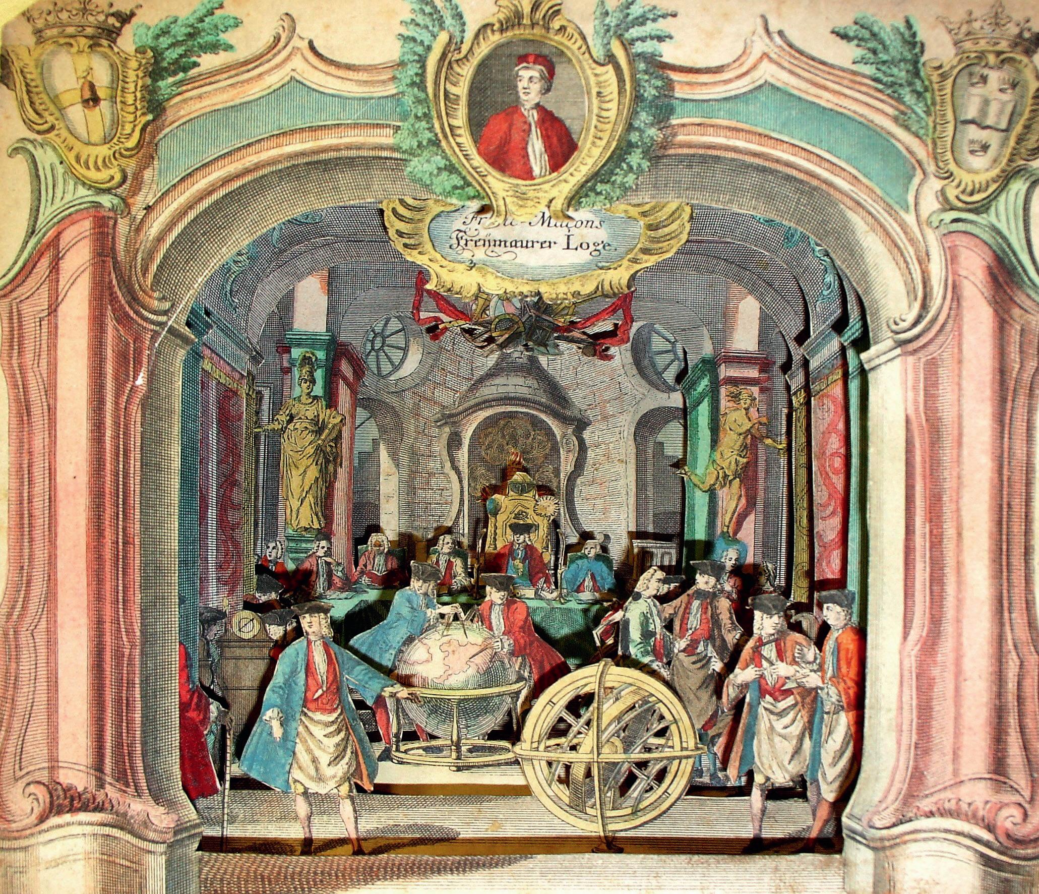 German engraver Martin Engelbrecht and his brother Christian made their living creating multilayered paper dioramas, between 1730 and Martin’s death in 1756. These depicted scenes from the Bible, mythology and history. They also created contemporary scenes, such as the Munich Oktoberfest and this meeting of German Freemasons. The miniature theatre can be viewed by visitors at the Museum of Freemasonry.