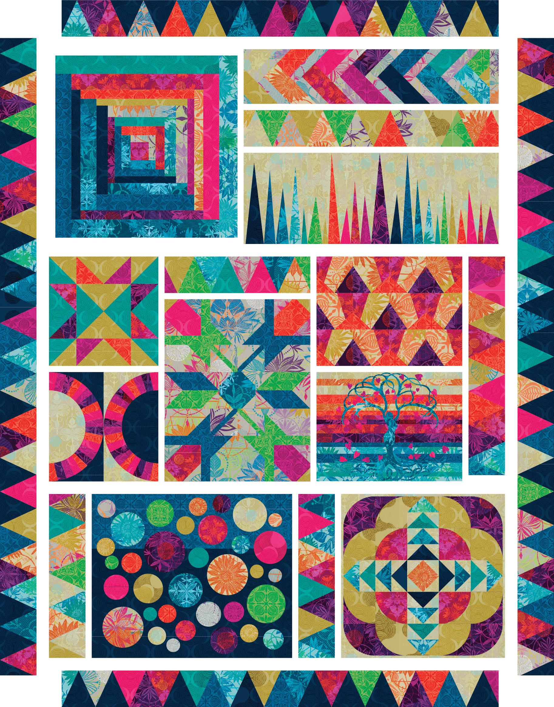 1. Noting Quilt Layout on page 45 arrange the blocks in 3 rows as shown. Sew blocks within each row together, horizontally first, then vertically. Stitch rows together.