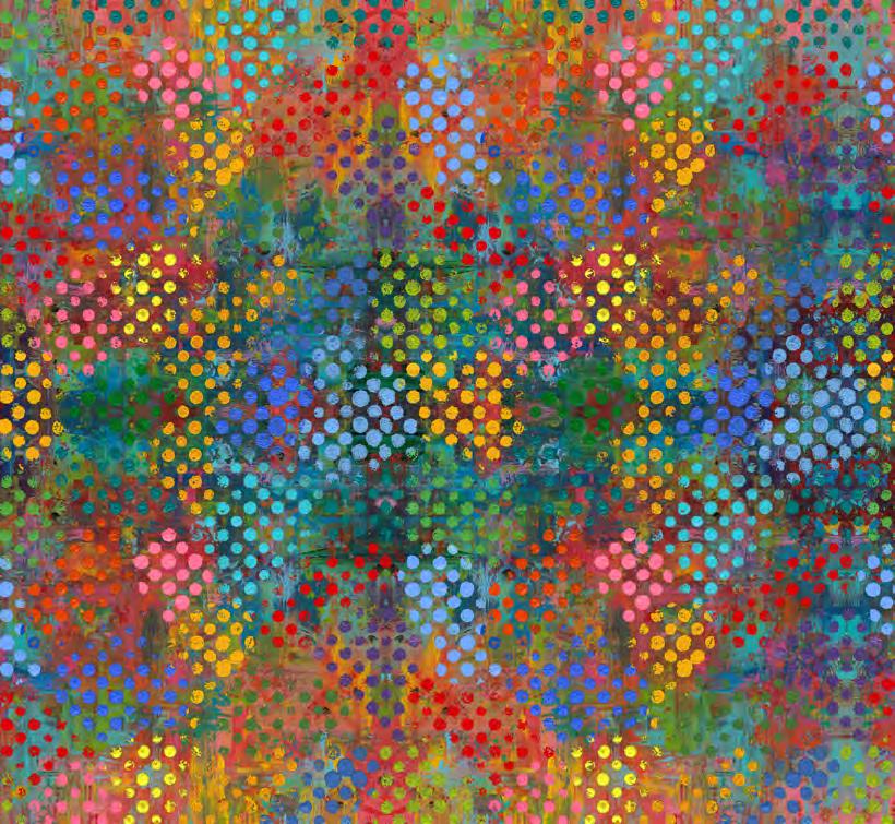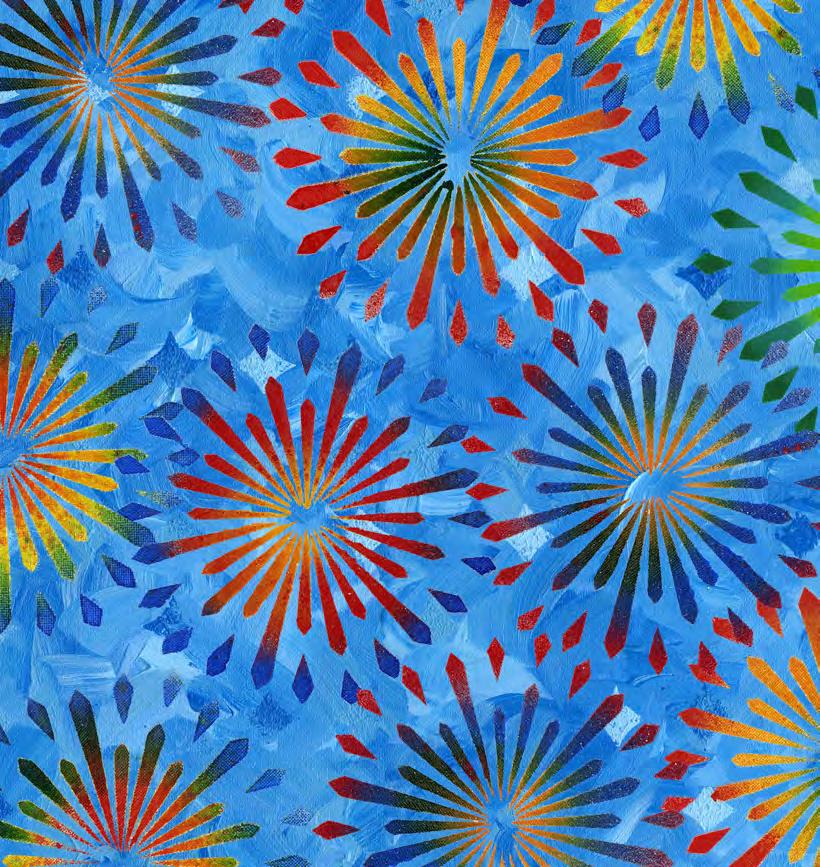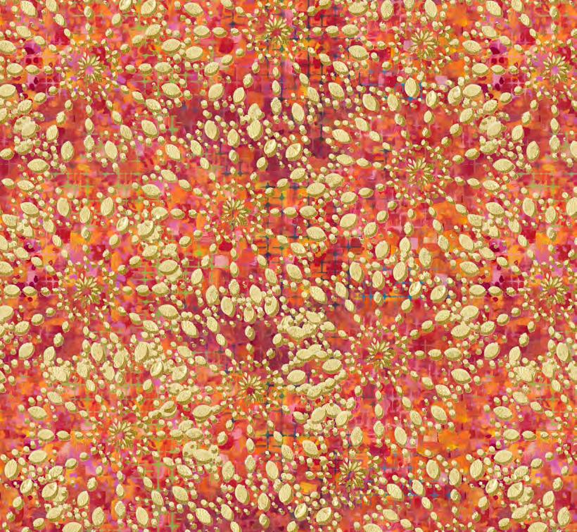 To complement the panel, I designed a variety of playful and colorful coordinating patterns. Tapestry features flowers and butterflies dancing on a rich blue-green background. Glow and Pebbles offer two cheerful dot patterns — Glow in a vivid pink and Pebbles in a bright rainbow of colors. Lacy showcases elegant medallions on a warm, rich ground of red, orange, and pink, while Fiesta bursts with vibrant, multi-colored starbursts.