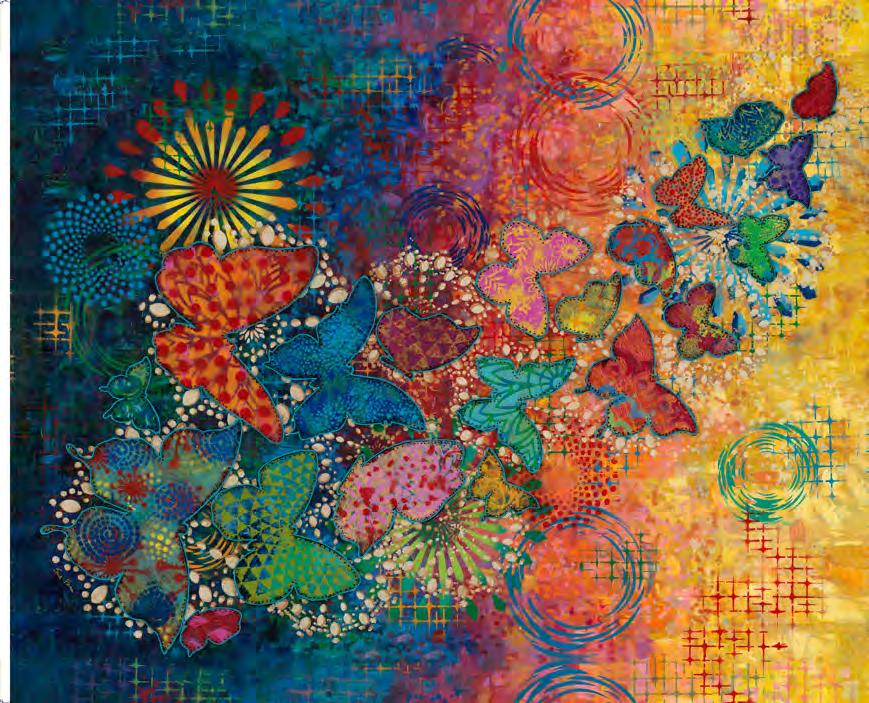 The centerpiece of this collection is a 1-yard panel featuring a vibrant rainbow background filled with intricate patterns and lacy medallions. Butterflies gently swirl across the fabric, starting with large, bold butterflies at the bottom and gradually transforming into smaller, whimsical butterflies at the top. This design captures the graceful movement and serene beauty of butterflies.