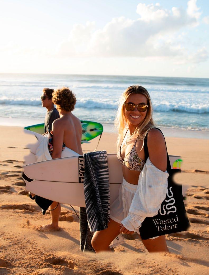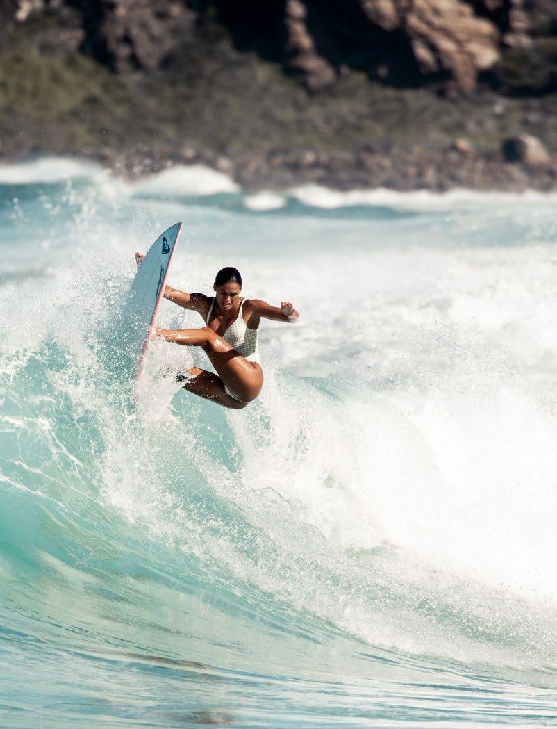 “I used to be super competitive and would love to go and make a bunch of heats and win everything,” says Pinkerton. “Lately, I’ve just really loved travelling and doing competitions. I’ve made good friends with people on tour and it’s like a big family—we all just push each other to get better at surfing.”