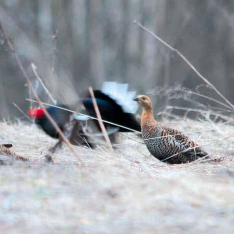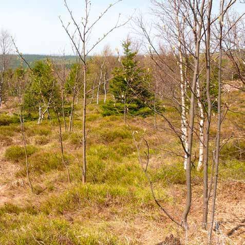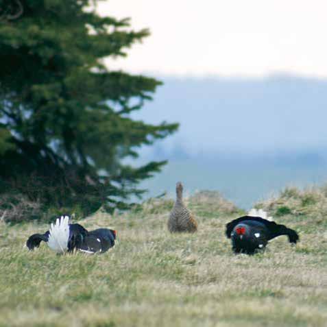 Moorwiesen besiedelt. Der Lebensraum des Birkhuhns ist spärlich mit Birken, Ebereschen, Moorkiefern und anderen niedrigen oder jungen Nadel- und Laubbäumen bewachsen. Außerdem müssen Heidel- und Preiselbeersträucher vorkommen.