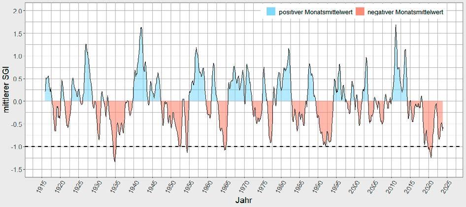 Abbildung 34: Gleitendes 6-Monatsmittel des Standardisierten Grundwasserindizes (SGI) für den Landesmittelwert von Sachsen 1916 bis 2023; übernormaler GW-Stand (blau), unternormaler GW-Stand (rot).