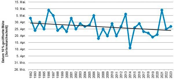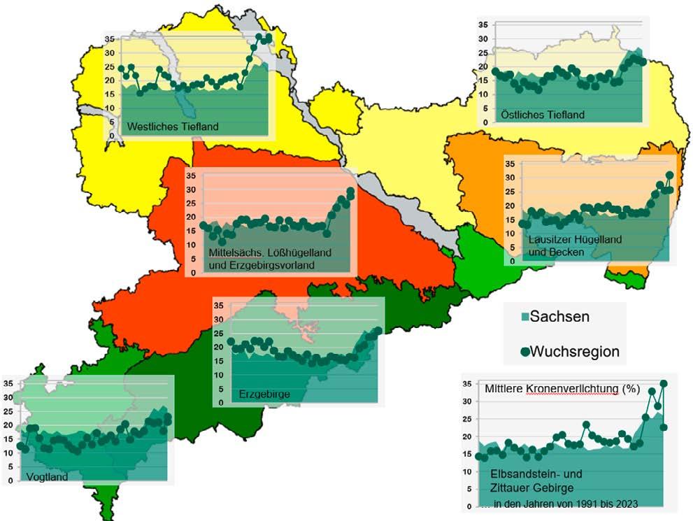 Abbildung 36: Veränderung der mittleren Kronenverlichtung [%] von 1991 bis 2023 in den sächsischen Wuchsregionen (Punktlinie) im Vergleich zum Landestrend (Fläche)