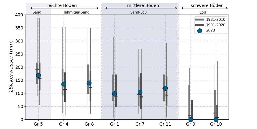 Abbildung 32: Auf der Lysimeterstation Brandis beobachtete Jahressummen der jährlichen Sickerwassermengen für 8 verschiedene Bodengruppen im Abflussjahr 2023. Die grauen Boxplots repräsentieren die im Referenzzeitraum 1981 – 2010 beobachteten Verteilungen der jeweiligen jährlichen Größen und dienen der statistischen Einordnung.