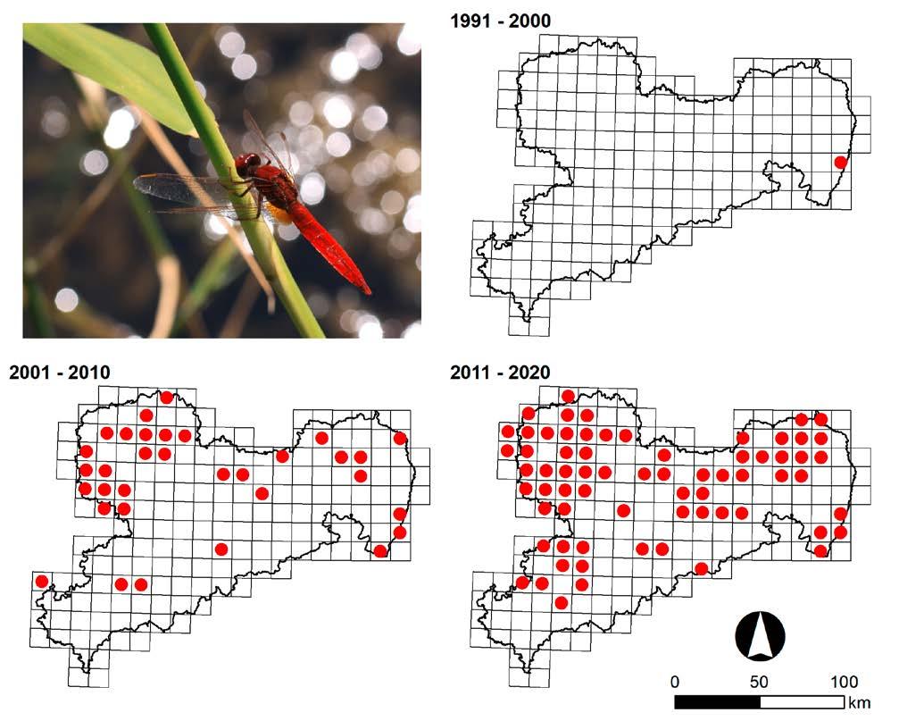 Abbildung 40: Ausbreitung der ursprünglich südlich verbreiteten Feuerlibelle (Crocothemis erythraea) infolge des Klimawandels