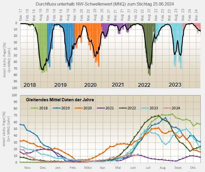 Abbildung 33: Anteil sächsischer Pegel mit einer Wasserführung kleiner/gleich des Niedrigwasser-Schwellenwertes MNQ für die Abflussjahre 2018 bis 2023; es handelt sich um eine wöchentlich aktualisierte Stichtags-Auswertung 79