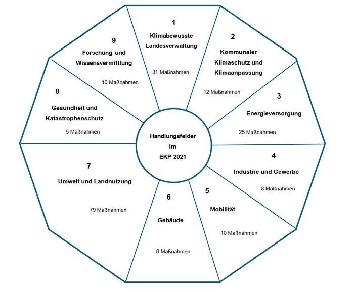 Im Handlungsfeld 1 - Klimabewusste Landesverwaltung ist das Ziel verankert, im Rahmen der Vorbildfunktion der öffentlichen Hand bis 2040 weitgehend Klimaneutralität zu erreichen. Die bisher beschlossenen 31 Maßnahmen bilden dafür eine Grundlage. Dabei nimmt die öffentliche Hand eine Vorbildfunktion unter dem Grundsatz „vermeiden – reduzieren – kompensieren“ (EKP 2021, 2021, S. 35) für die Umsetzung der angestrebten Ziele ein.