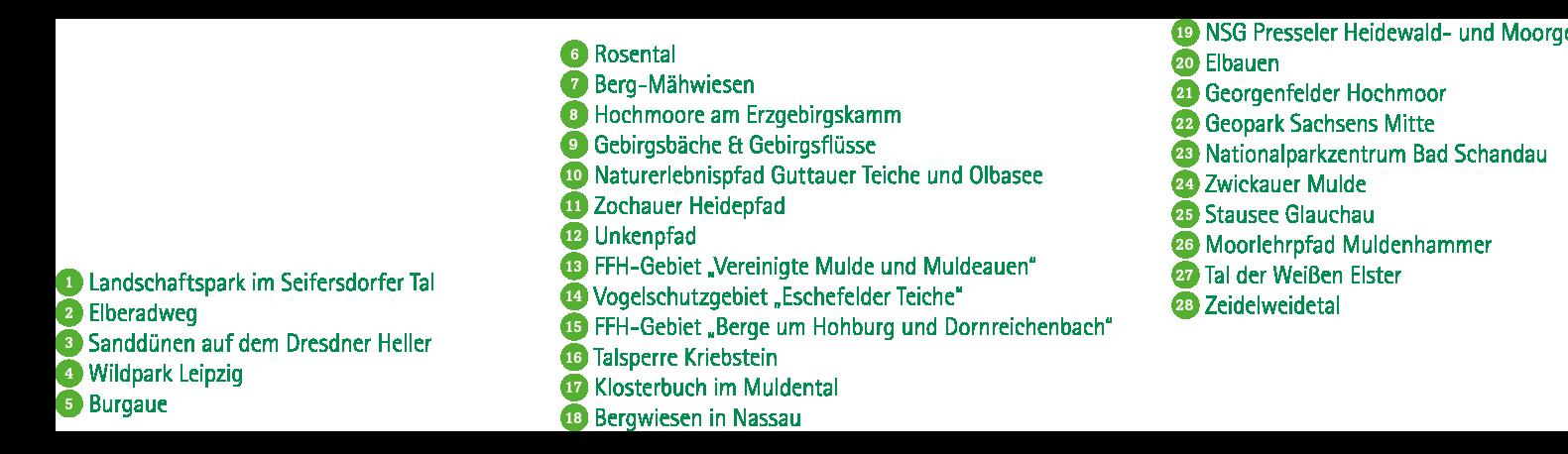 www.adobestock.de/Michael Drak (Titel); Heinz Rothacher (Wissenswertes – Hirschkäfer); Rüdiger Kaminski (Wissenswertes – Neuntöter) ; Archiv Naturschutz LfULG: C. Mäser, W. Fiedler (Natura 2000); C. Barthel, O. Bastian, P. Costa (Landeshauptstadt Dresden); Amt für Umweltschutz Leipzig/ Julia Zimmerhäkel (Stadt Leipzig); Naturschutzzentrum Erzgebirge gGmbH, www.adobestock.com: sylviaadams, Gunar (Erzgebirgskreis); Winfried Nachtigall, Dirk Synatzschke, Naturschutzstation Neschwitz (Landkreis Bautzen); Sven Möhring (Landkreis Leipzig); Landratsamt Mittelsachsen: Andrea Funke, Norman Schiwora, Förderverein Kloster Buch e. V. (Mittelsachsen); Landkreis Nordsachsen, Knut Fischer, Frank Meyer (Landkreis Nordsachsen); Hanspeter Mayr, Holger Menzer, Dietmar Knaut, Dr. Bernard Hachmöller, Robert Michael, Jan Gutzeit, Dirk Neubert (Landkreis Sächsische SchweizOsterzgebirge); Oliver Göhler, www.adobestock.com/weixx , Christian Koppitz (Landkreis Zwickau); Landratsamt Vogtlandkreis, Dr. Matthias Ludwig, Thomas Findeis, Harald Hertel, Dr. Wolfgang Böhnert (Vogtlandkreis); www.adobestock.com: JRG, Daniel Hohlfeld, Buesi (Landkreiskarte)