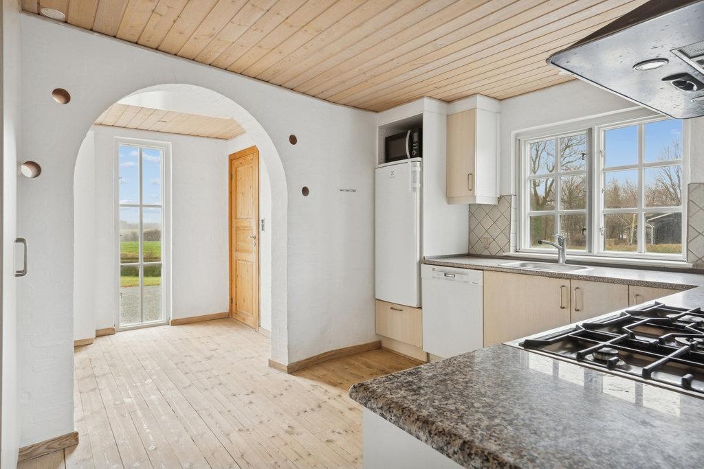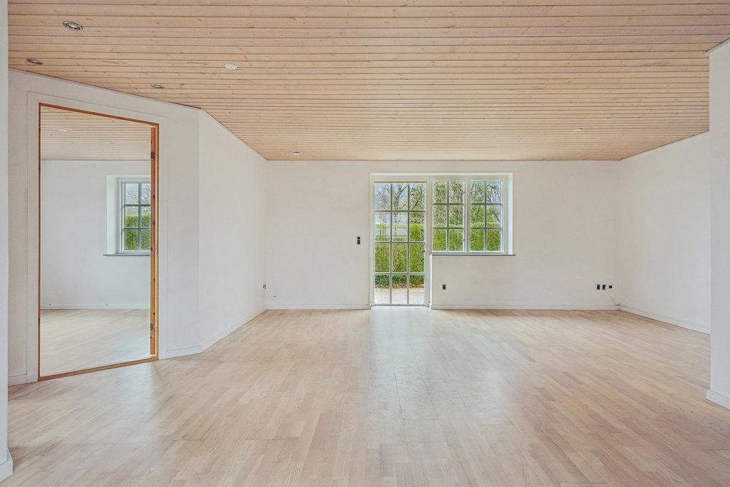Indenforskabertrægulveoglysematerialerenharmoniskogimødekommendeatmosfære.Entréenleder tilfordelingsgangenmedadgangtiltoafhusetsfireværelserogetaftrebadeværelser.Køkkenalrummeti åbenforbindelsemedspiseafdelingensamtgodskabs-ogbordpladsogadgangtildenstore opholdsstue,hvorvinduespartiergiverflotudsyntilterrassenoghaven.