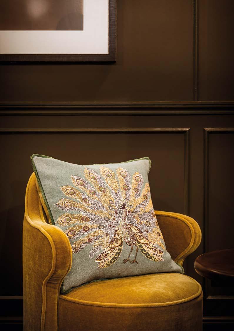 The splendid wheel made by this peacock lls the entire cushion. It takes on powdery and delicate hues.