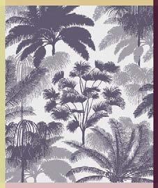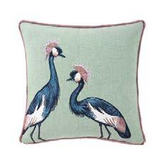 Adorned with feathered tiaras, two crowned cranes display their natural majesty on a celadon or soft violet hue. A fringed nish recalls the ornamentation of their coi ure. Cotton Jacquard tapestry, woven in Belgium.