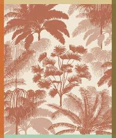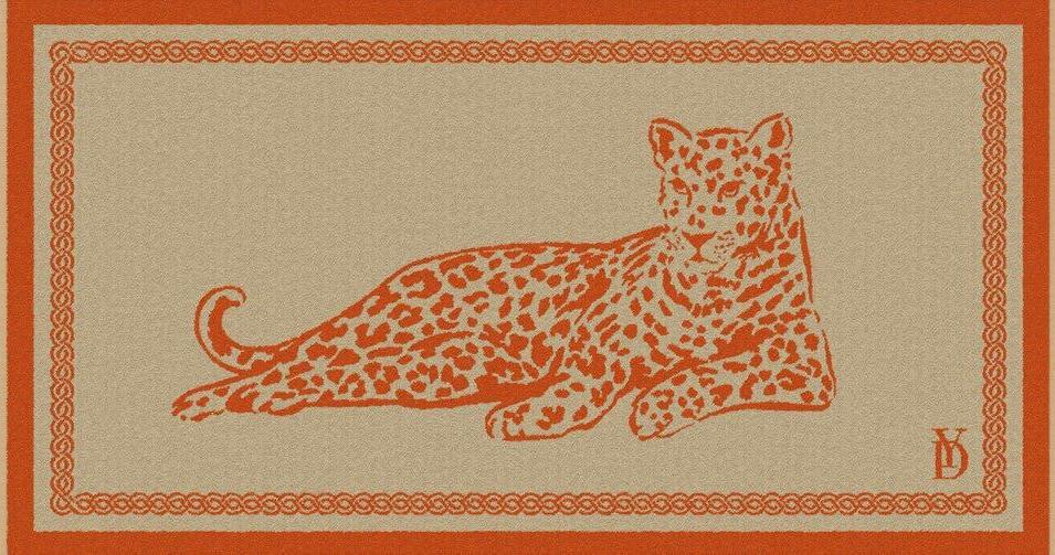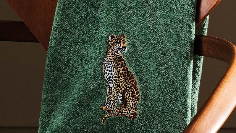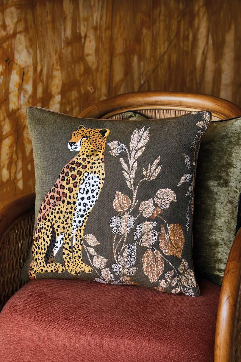 En miroir ou en grand portrait, ces panthères altières s’entourent de feuillages ombrés et d’une bordure à motif galuchat. Modèle tissé en Belgique.