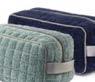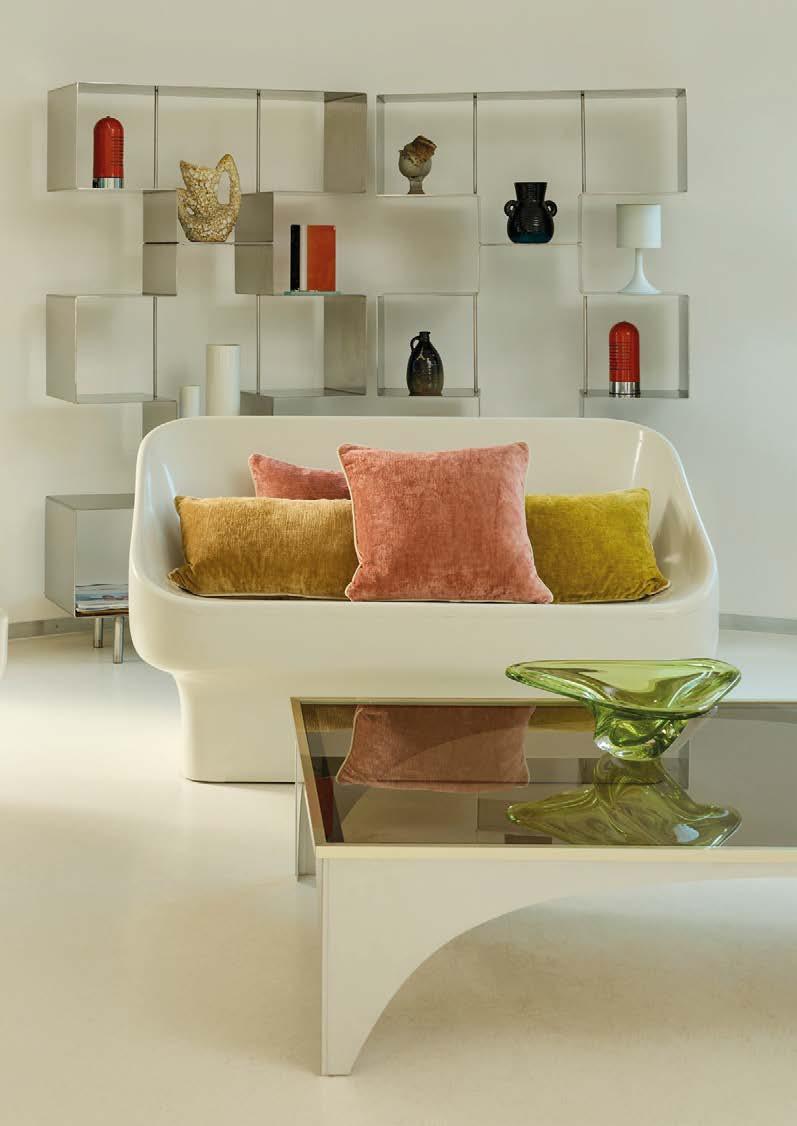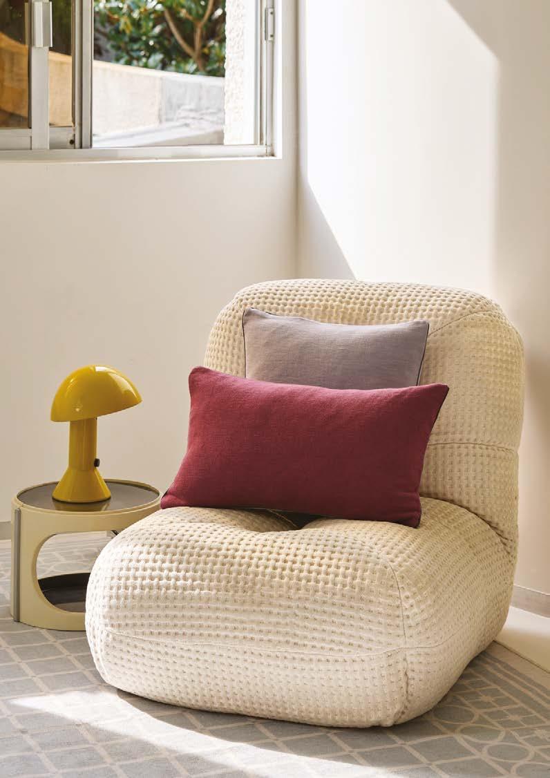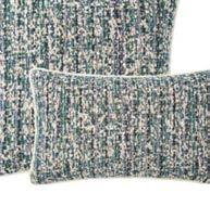 Choose 4 shades from hundreds of colours of thread spools, then weave them without trying to create a pattern and obtain a contemporary blur that lets the colours express themselves. The weaving of cross-pattern velvet magni es the e ect. Jacquard weaving with fringe nish and zipper closure at bottom. Mainly cotton. 13’’×22’’ and 18’’×18’’.