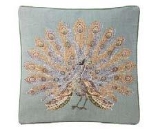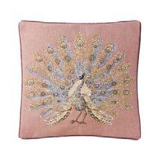 La roue merveilleuse que fait ce paon remplit tout un coussin. Elle prend des teintes poudrées et délicates.