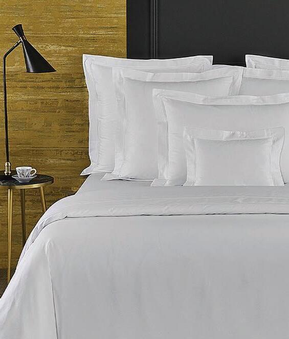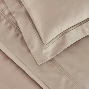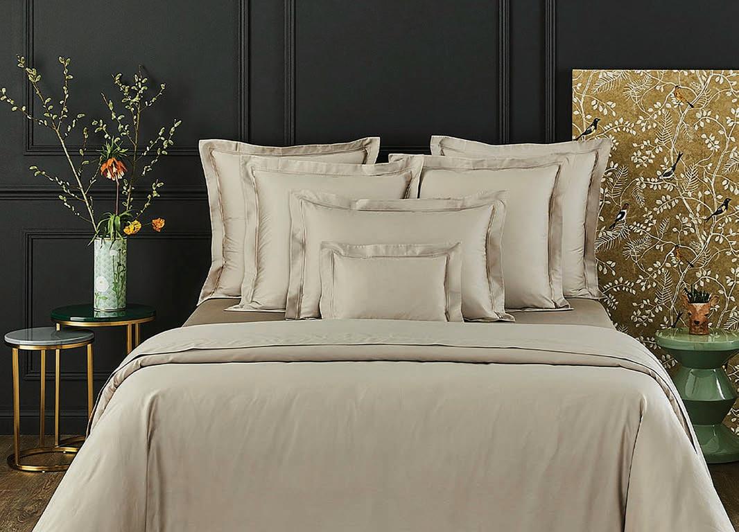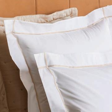 Satin, 100% Supima coton peigné longues fibres, 200 fils/cm². Finition parement double. Broderie machine guidée main point sellier. Adagio coloris Noisette pour la photo 1 ; Blanc pour les photos 2 et 3. 100% Supima long staple combed cotton sateen, 500 thread count. Reversible flange finish. Hand guided saddle stitch. Picture 1 :
