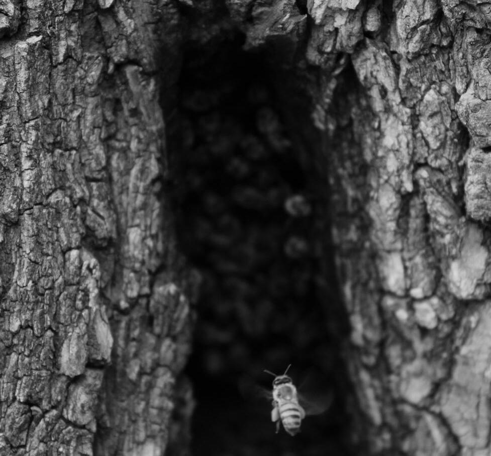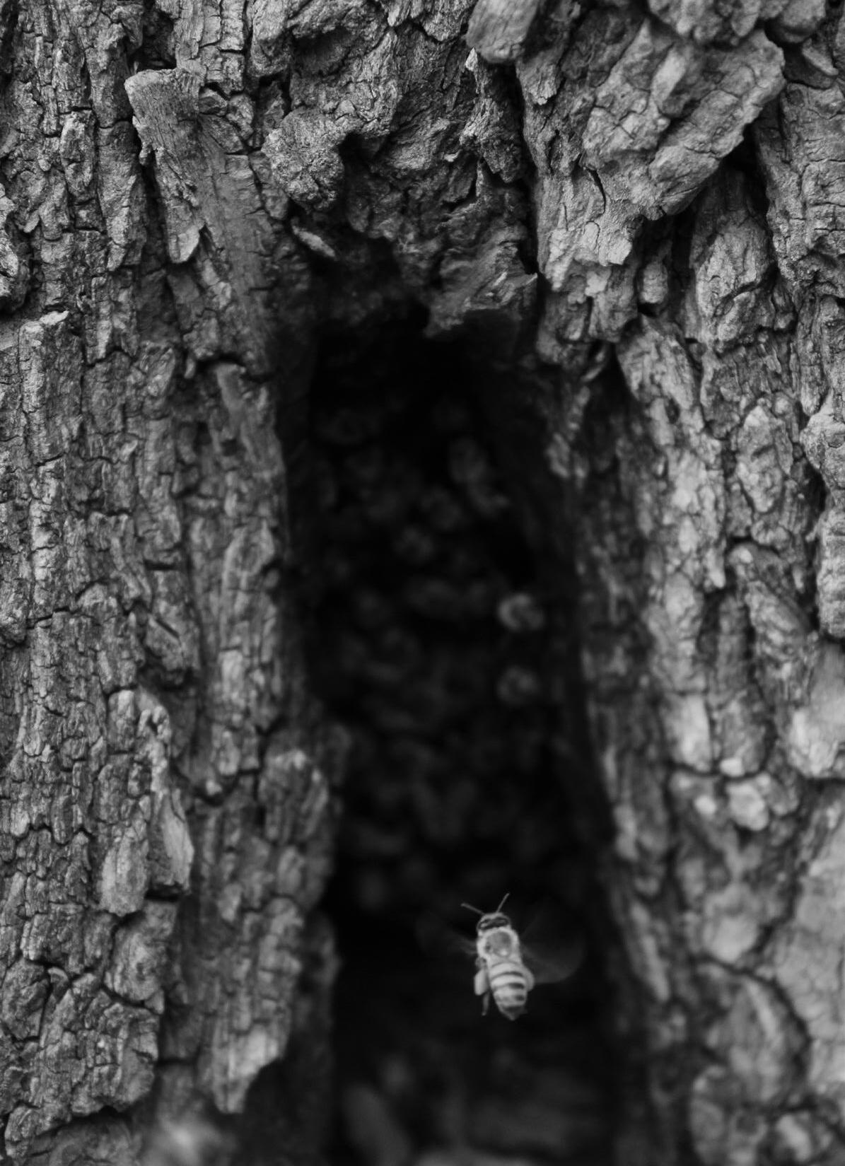 Técnica de congelado con luz y sombra. ISO 200. Resaltando texturas y a la abeja entrando a su curioso panal.