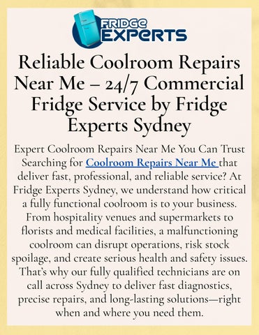 Fridge Experts provides top-quality fridge and coolroom repairs across Sydney. Whether you’re in need of coolroom repairs near you or reliable fridge repairs, our expert technicians are here to deliver fast, professional service. We specialise in fridge repairs Sydney-wide, offering efficient and affordable solutions for all makes and models. From small repairs to larger issues, we ensure minimal downtime and long-lasting results. If you need coolroom repairs Sydney or fridge repairs near me, Fridge Experts is the name you can trust. Contact us today for fast and dependable service!