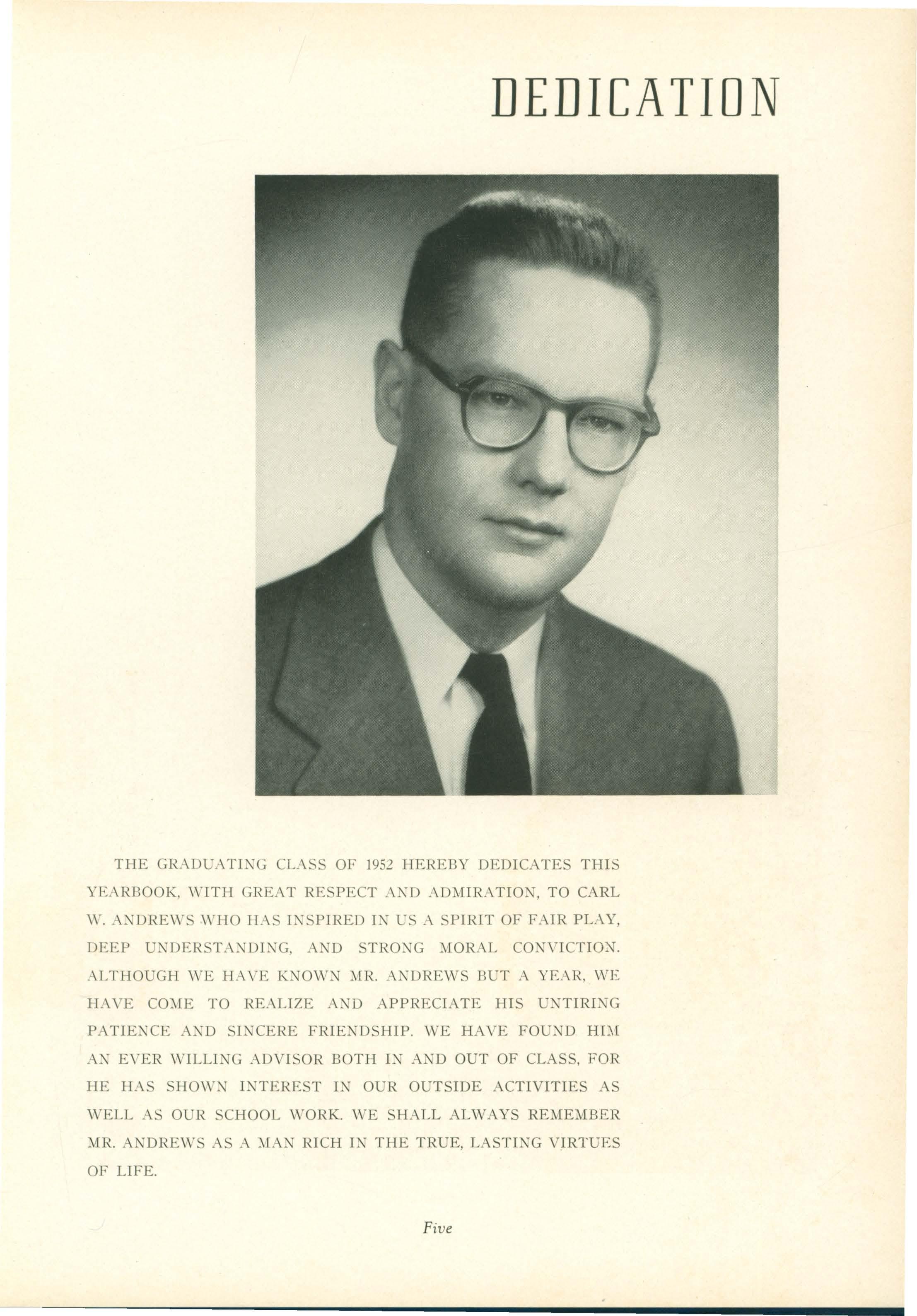 THE GRADU r\TING CL'\SS OF 1952 HEREBY DEDICATES TI-llS YE t\RBOOK , WITH GH.EAT RESPECT AND !\DMIRA , TO CARL W. WIIO IIAS !.\'SPIRED DJ US \ SPIRIT OF FAIR PLAY, DEEP UNDERSTA:.JDI:.JG , A I D CONVICTION. ALTHOUGH WE HAVE KNOWN MR. :\NDREWS BUT A YEAR, WE HAVE TO RE r\LIZE AND APPRECIATE HIS PATIENCE AND SH\CERE FRIENDSHIP WE HAVE HIM AN EVER WILLING .-\DVISOR BOTH IN AND OUT OF CLASS, FOR HE HAS L 0 R OUTSIDE ACTIVITIES AS WELL -\S OUR SCHOOL WORK. WE SHALL ALWAYS RE1IEMBER MR. ANDREWS AS A RICH IN THE TRUE, LASTING VIRTUES OF LIFE.