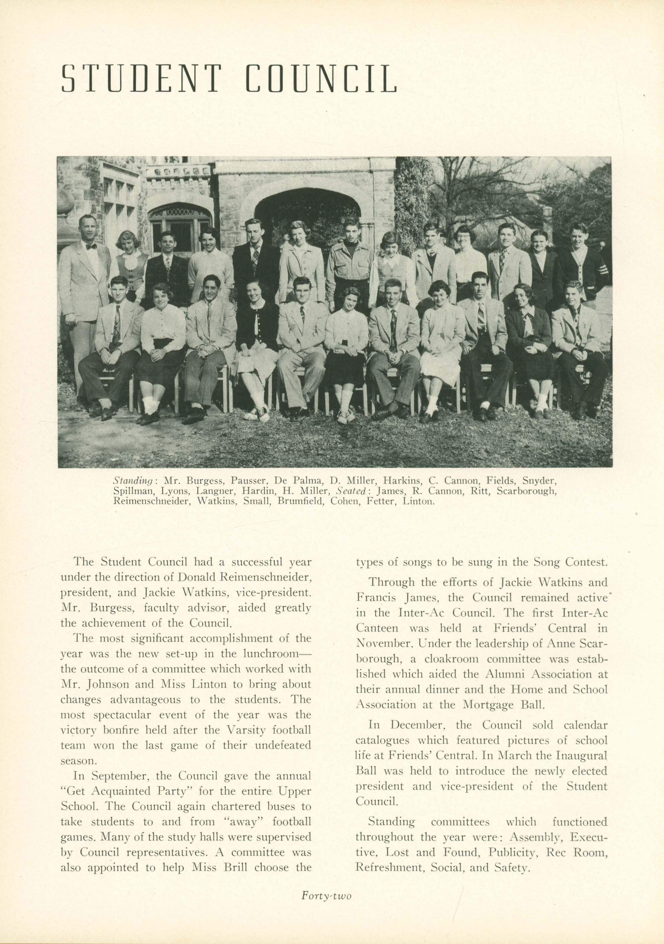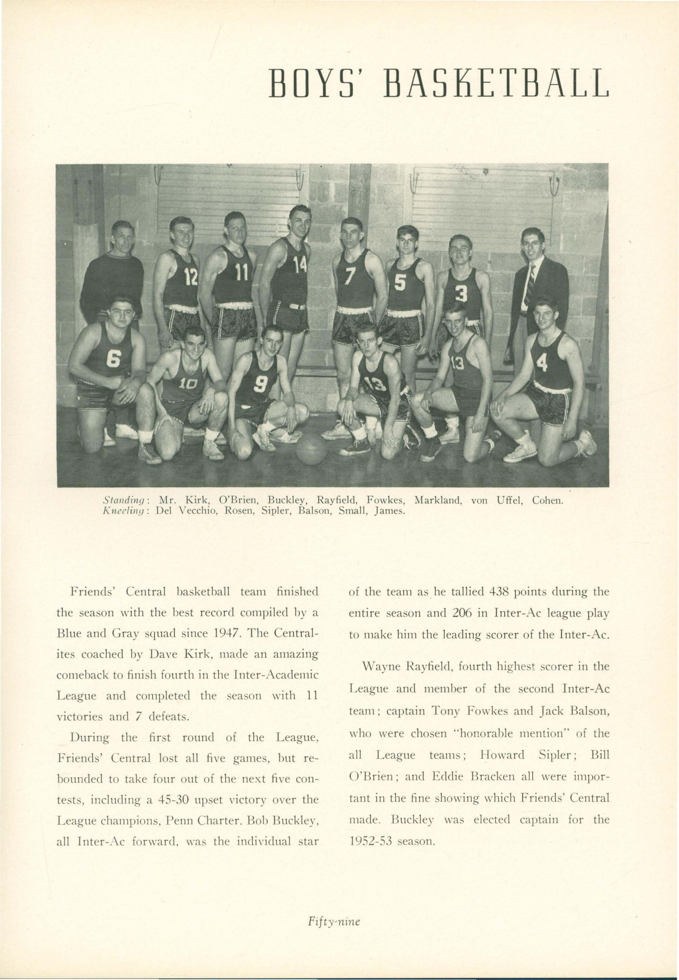 of the team as he tallied 438 points during the entire season and 206 in Inter-Ac league play to make him the leading scorer of the Inter-Ac. Wayne h.ayfielcl. fourth highest scorer in the League and member of the second Inter-Ac team: captain Tony Fowkes and Jack Balson, \\"ho \rere chosen "honorable mention" of the all League teams; Howard Sipler; Bill O'Brien; and Eddie Bracken all ,,·ere important in the fine sho\\"ing which Friends' Central made. Buckley ,,·as elected captain for the 1952-53 season.