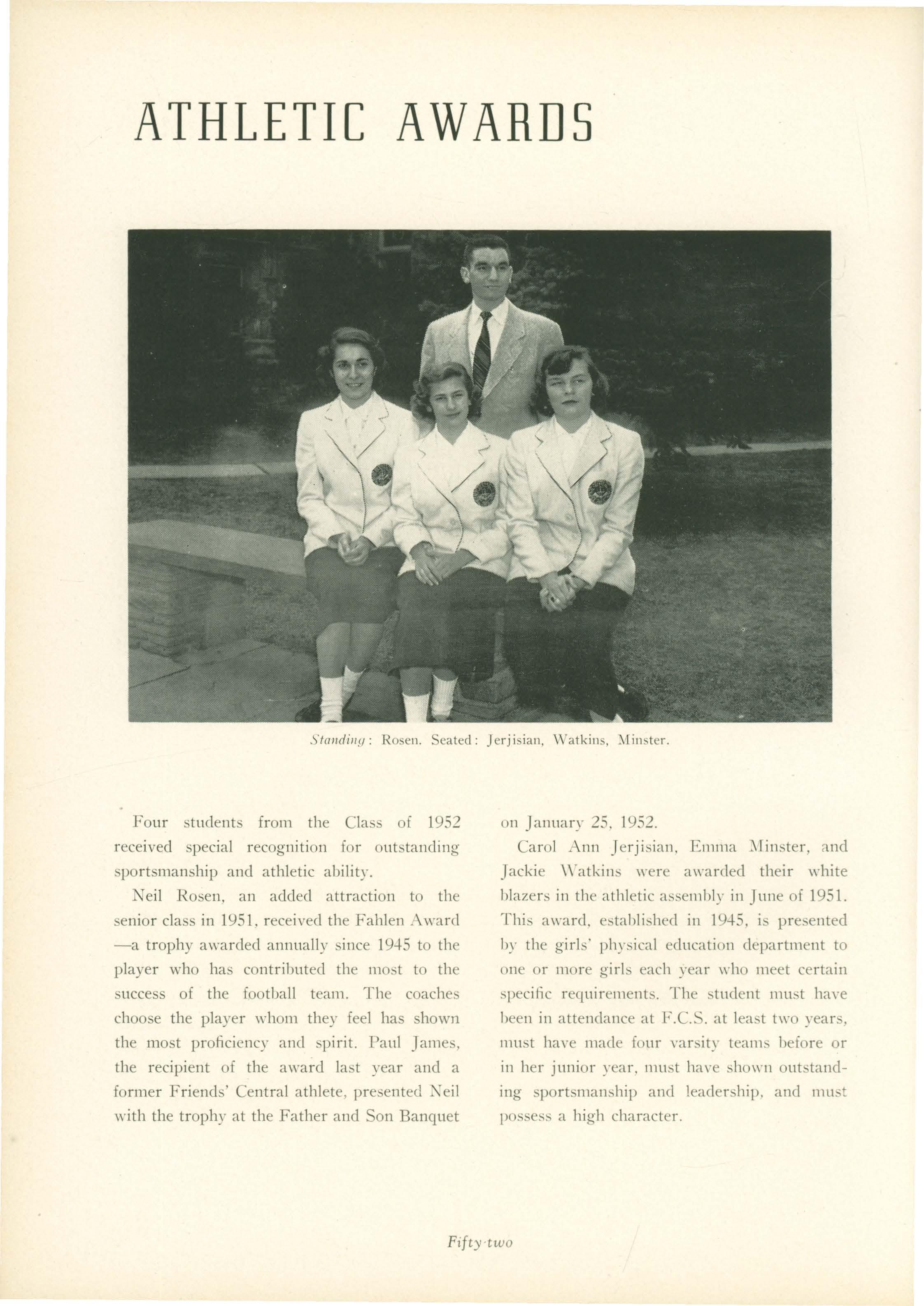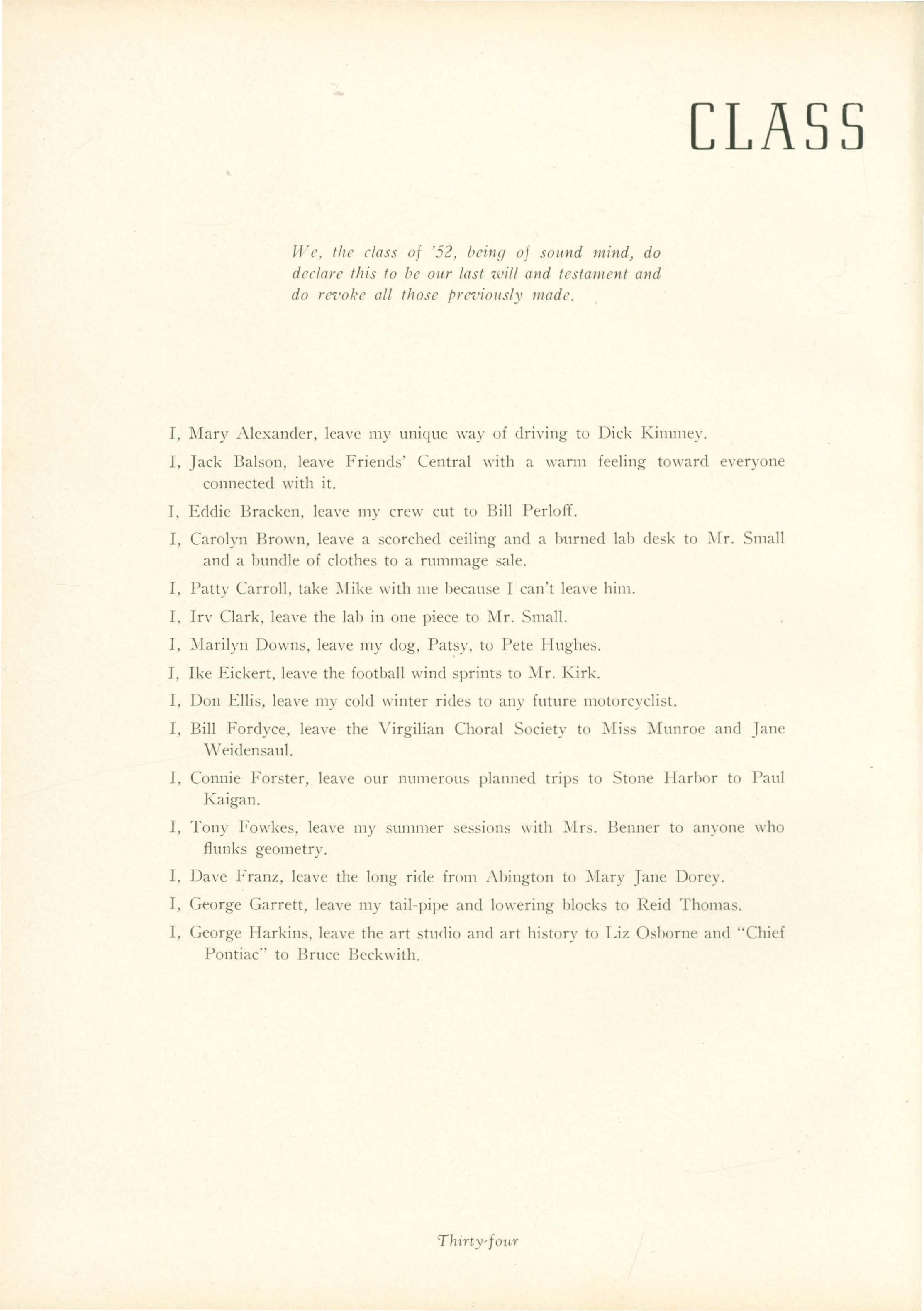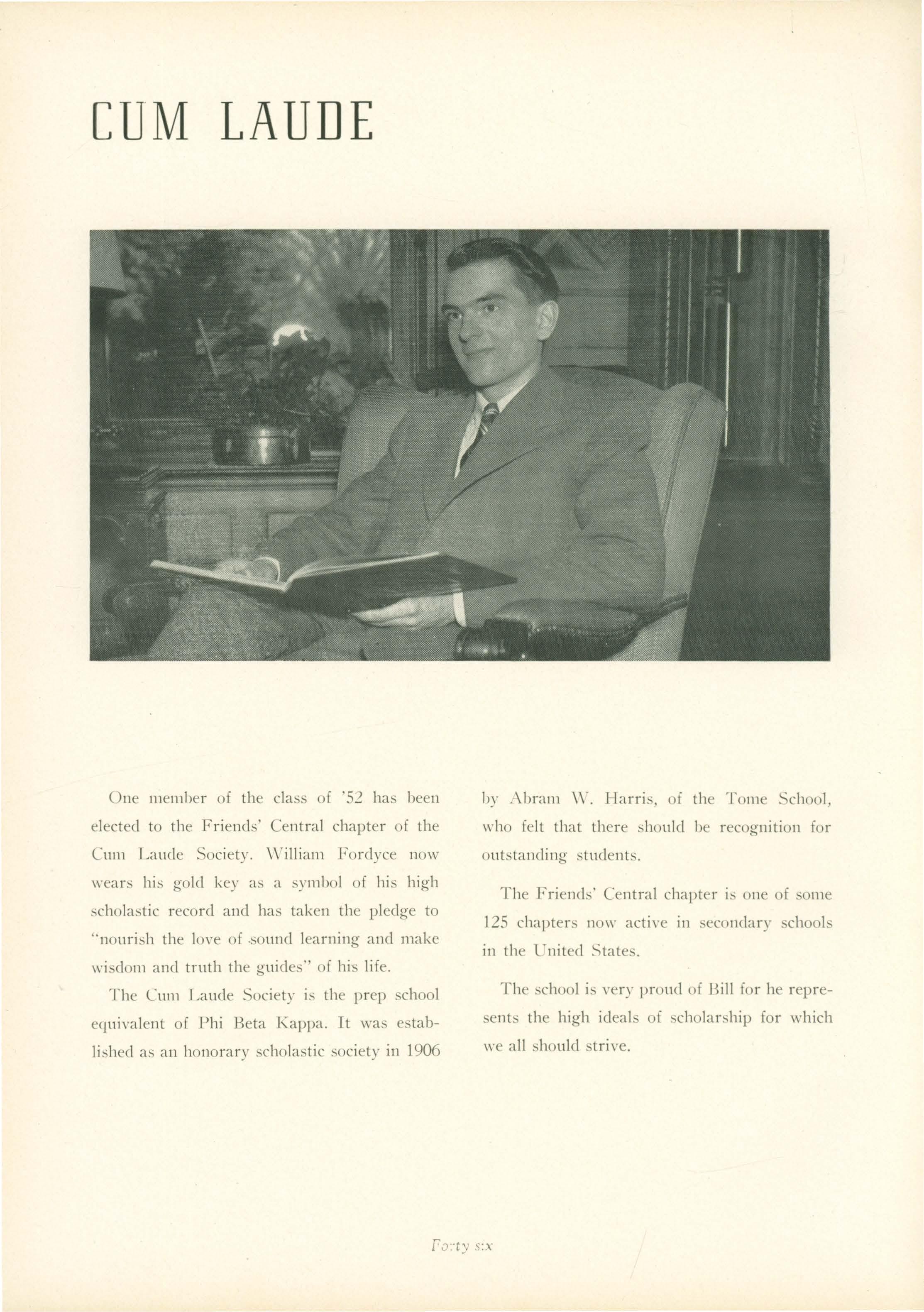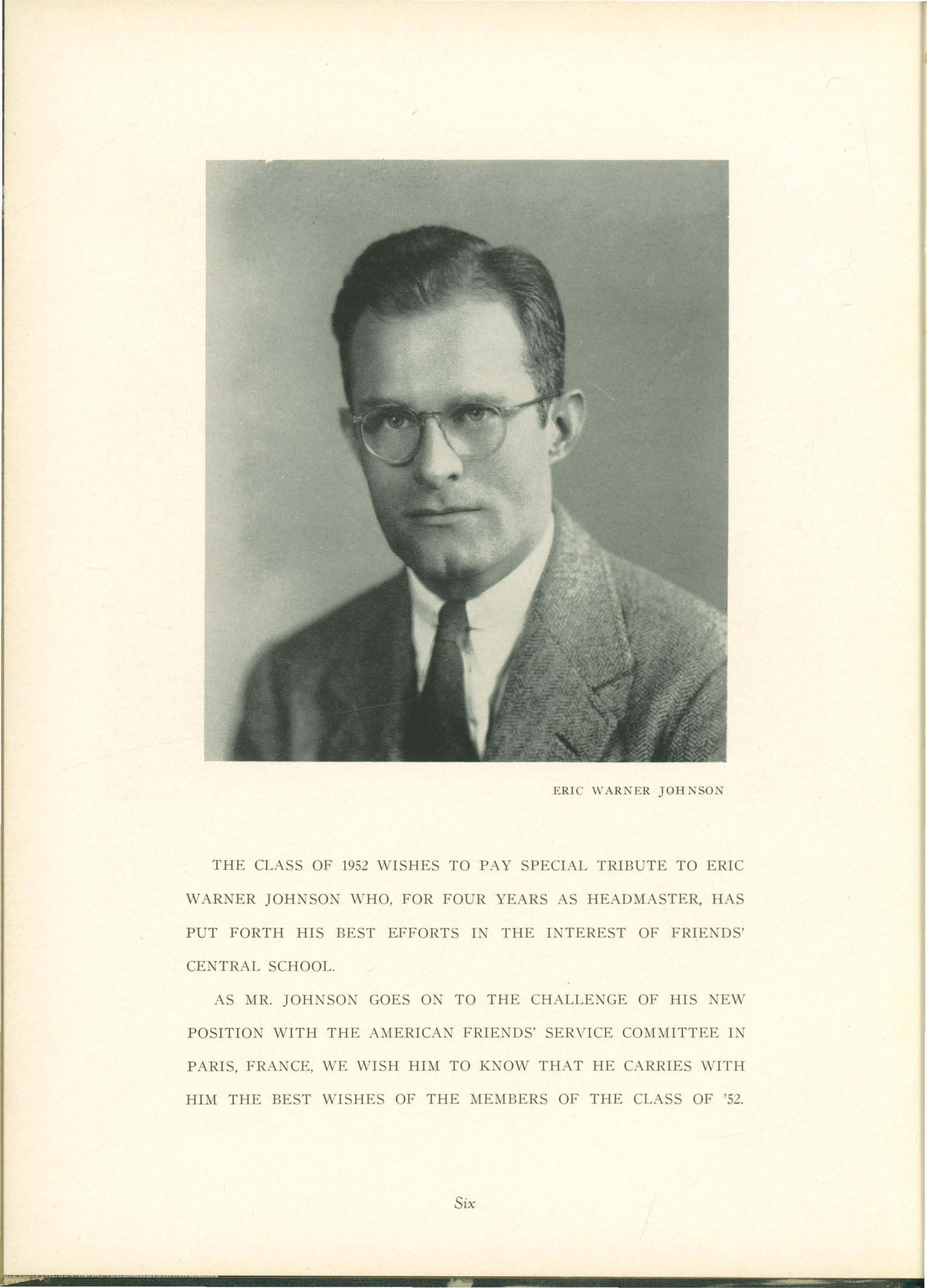 THE CLA S OF 1952 WISHES TO PAY SPECIAL TRIBUTE TO ERIC WAR ER JOHNSON WHO , FOR FOUR YEARS AS HEADMASTER, HAS PUT FORTH HIS BEST EFFORTS IN THE INTEREST OF FRIENDS ' CENTRAL SCHOOL.
