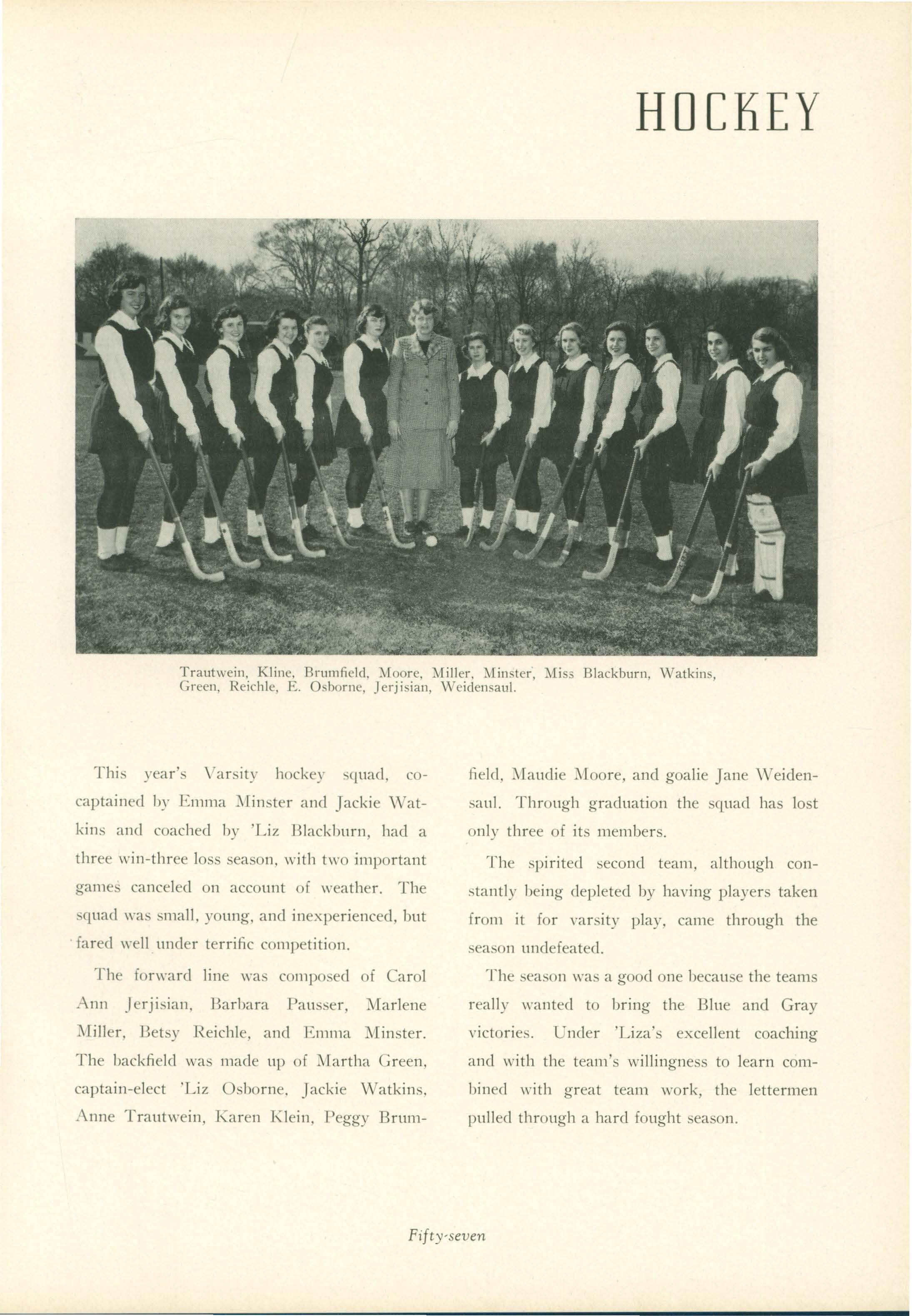 Each game was fought with courage, determination, and above all. good sportsmanship. Even though the team won but two, tied one and lost four. the season was a good one. Since there were only three seniors on the sq uad. . \nne Trautwein. captain-elect for 1953 and Coach 'Liza Blackburn can look forward to a promising seaso n for next year.