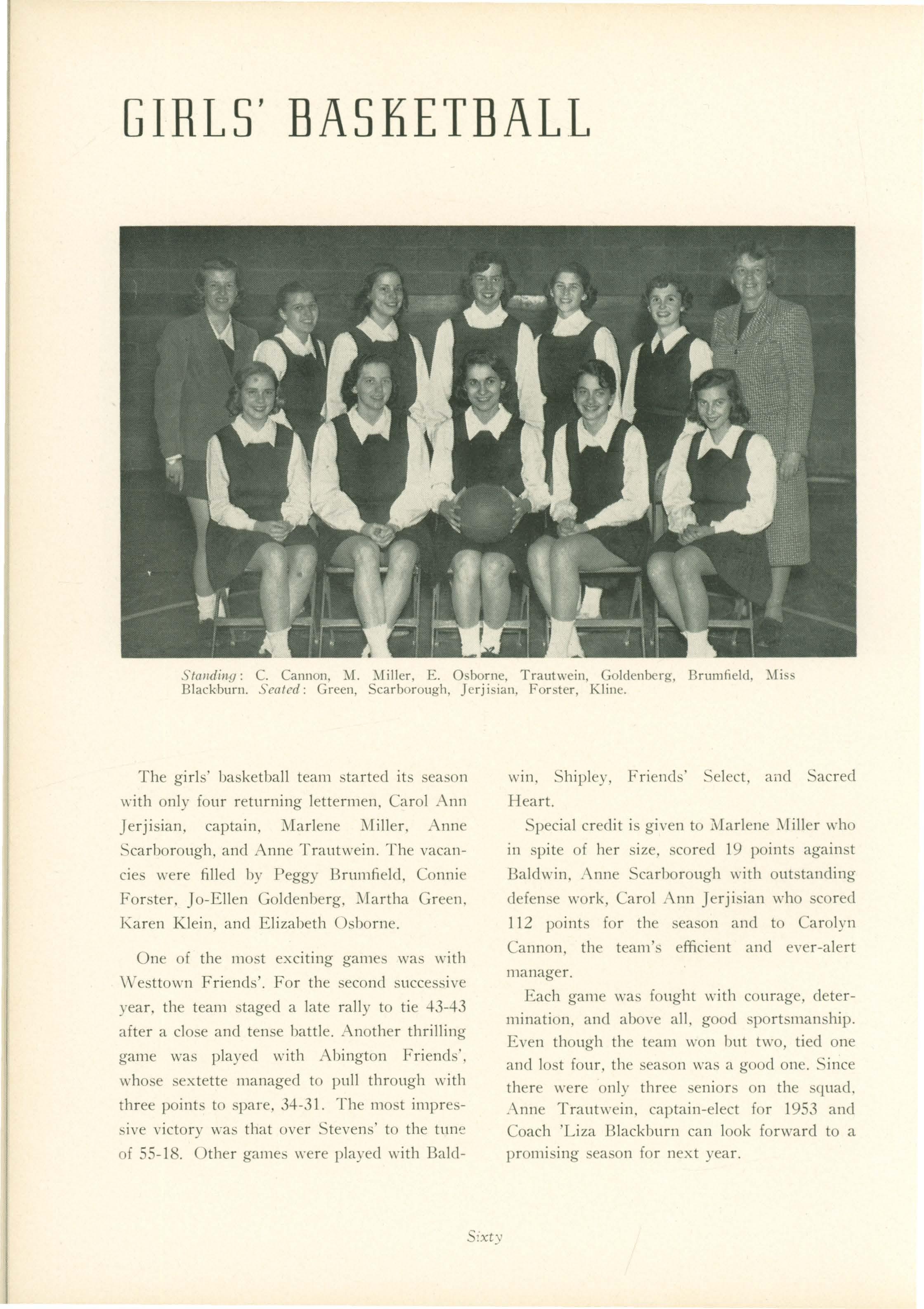 The girls' basketball team started its season with only four returning lettermen. Carol Ann Jerjisian, captain. Marlene l\1iller, Anne Sca rb orough. and Anne Trautwein. The vacancies were filled by Peggy Brumfield, Connie Forster, Jo-Ellen Goldenberg, Green. Karen Klein. and Elizabeth Osborne.
