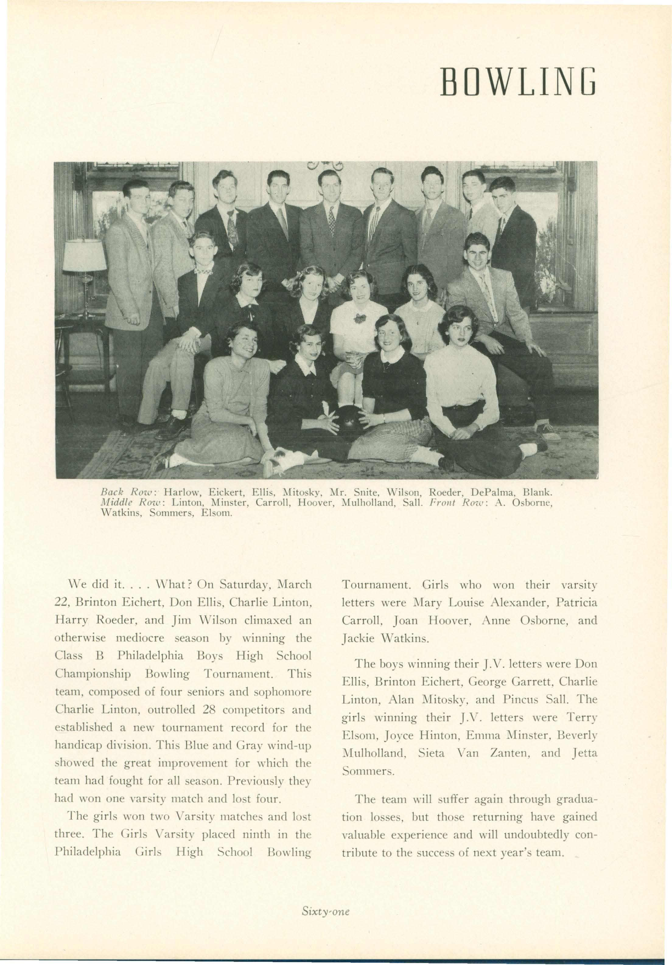\Ve did it. What? On Saturday. March 22. Brinton Eichert. Don Ellis, Charlie Linton. Harry Roeder. and Jim \Vilson climaxed an otherwise mediocre season by "·inning the Class B Philadelphia Boys High School Championship Bowling Tournament. This team, composed of four seniors and sophomore Charlie Linton. outrolled 28 competitors and established a new tournament record for the handicap division. This Blue and Gray wind-up showed the great improvement for \\·hich the team had fought for all season. Previously they had won one varsity match and lost four.