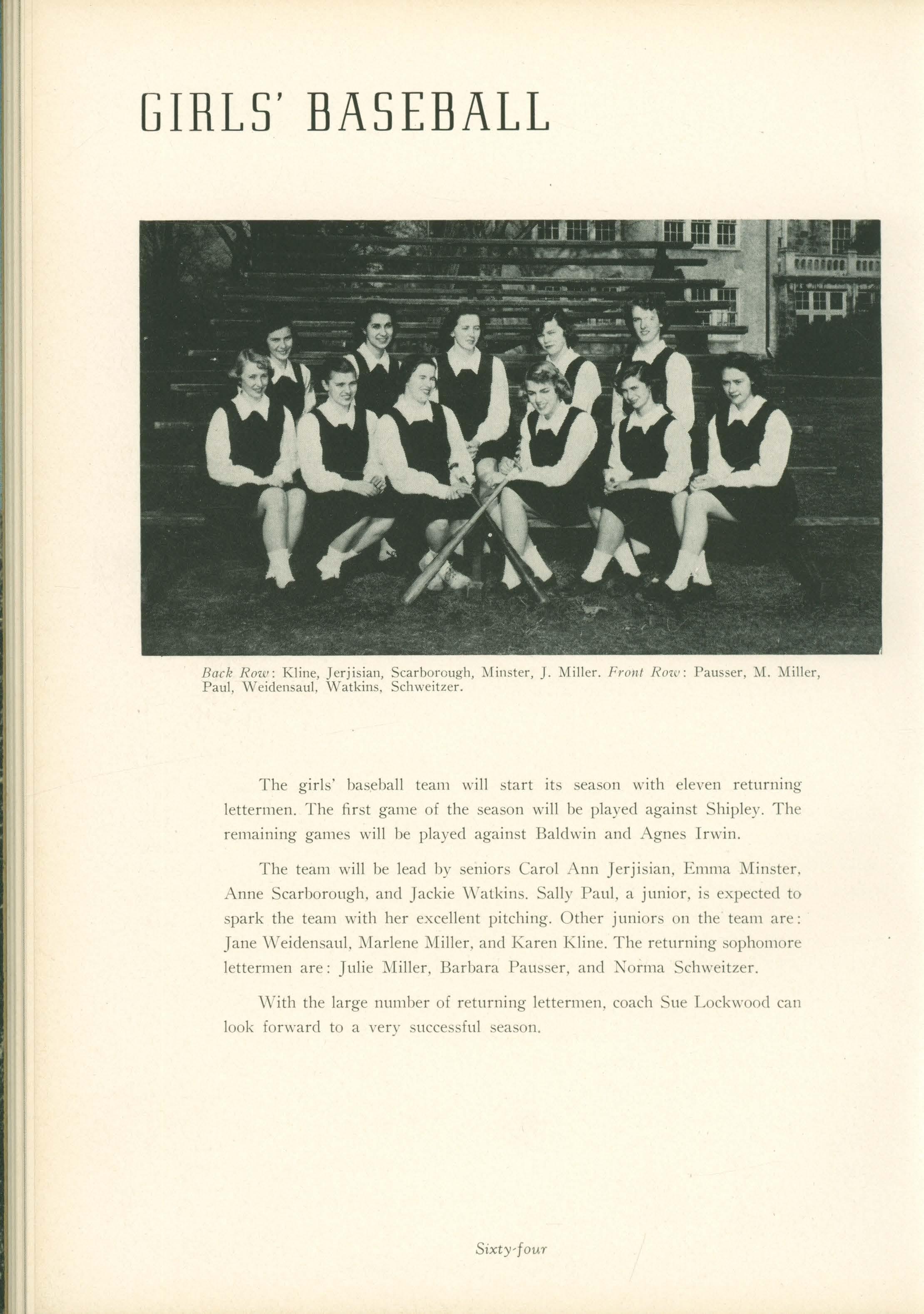 The team will be lead by seniors Carol Ann Jerjisian, Emma Minster. Anne Scarborough, and Jackie watkins. Sally Paul, a junior, is expected to spark the team with her excellent pitching. Other juniors on the team are: Jane \Veidensaul. ]\[arlene Miller, and Karen Kline. The returning sophomore lettermen are: Julie Miller, Barbara Pausser, and :t\ orma Schweitzer.