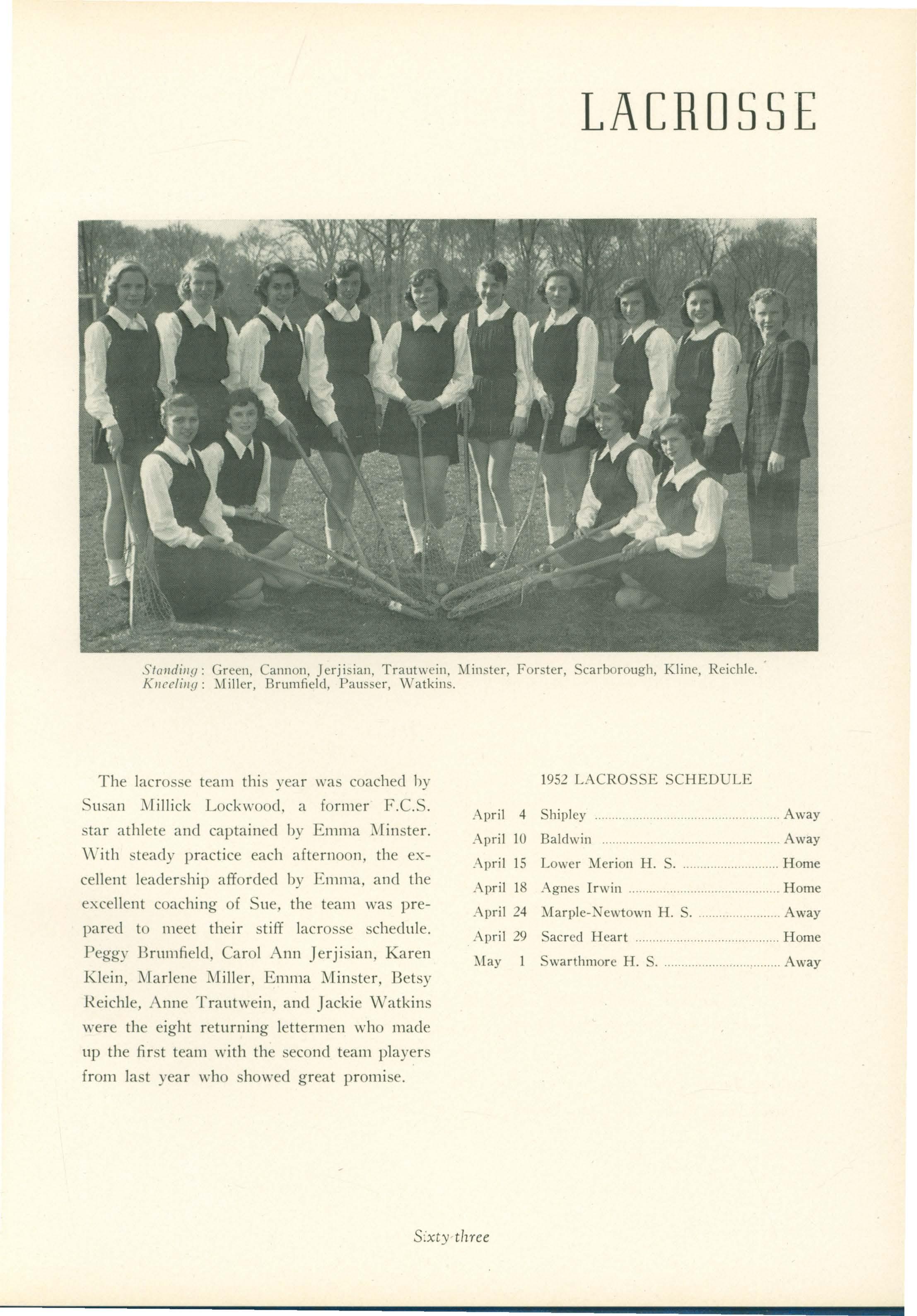 The lacrosse team this year \\'as coached by Susan J\lillick Lockwood. a former F.C.S. star athlete and captained by Emma J\[inster. \ Vith steady practice each afternoon, the excellent leader hip afforded by Emma, and the excellent coaching of Sue, the team was prepared to meet their stiff lacrosse schedule.
