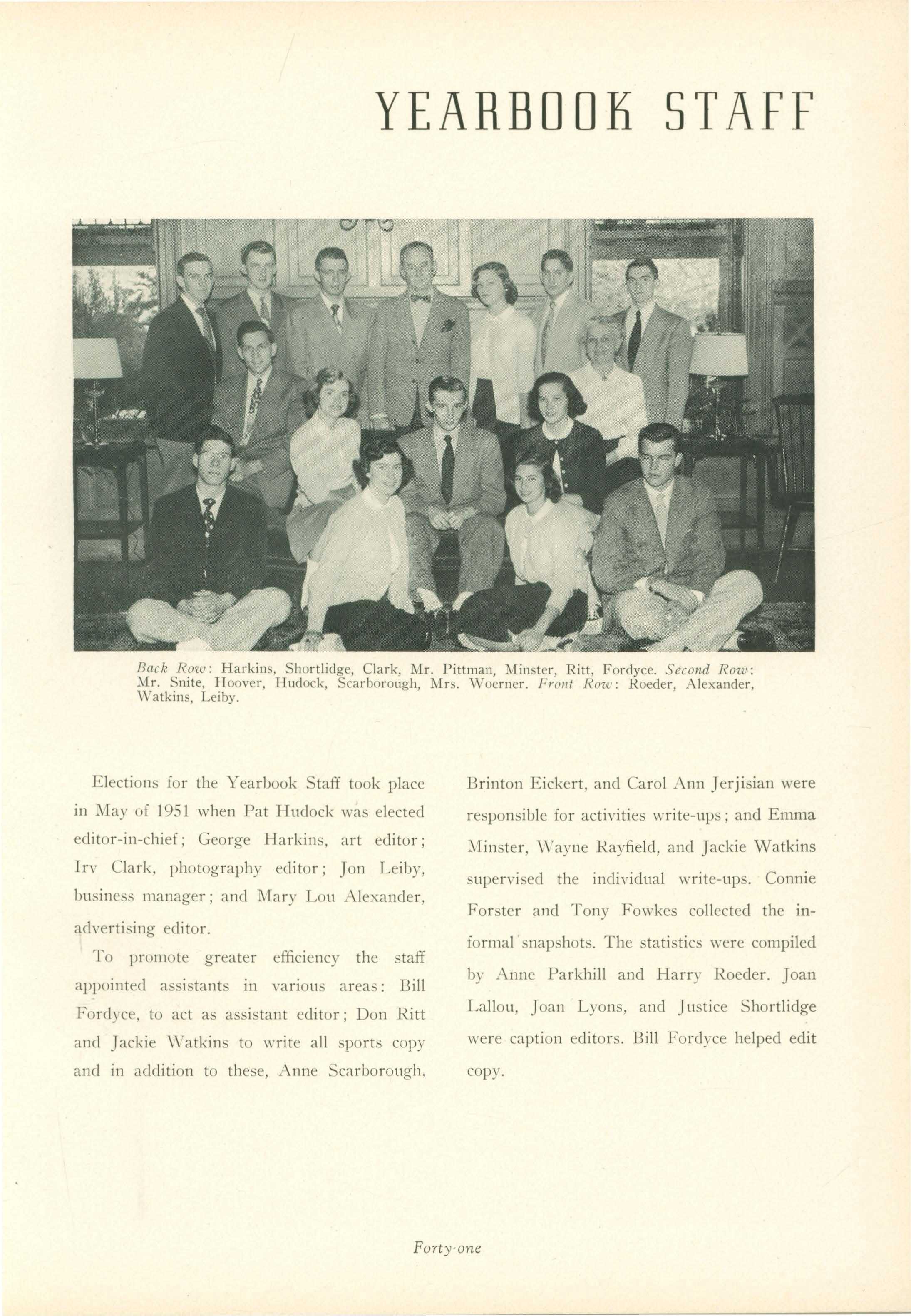 Bill. Mrs. Woerner began early in the year to gently prod into activity members of the Year Book Staff, and we must admit that we appreciated it when deadlines came around.