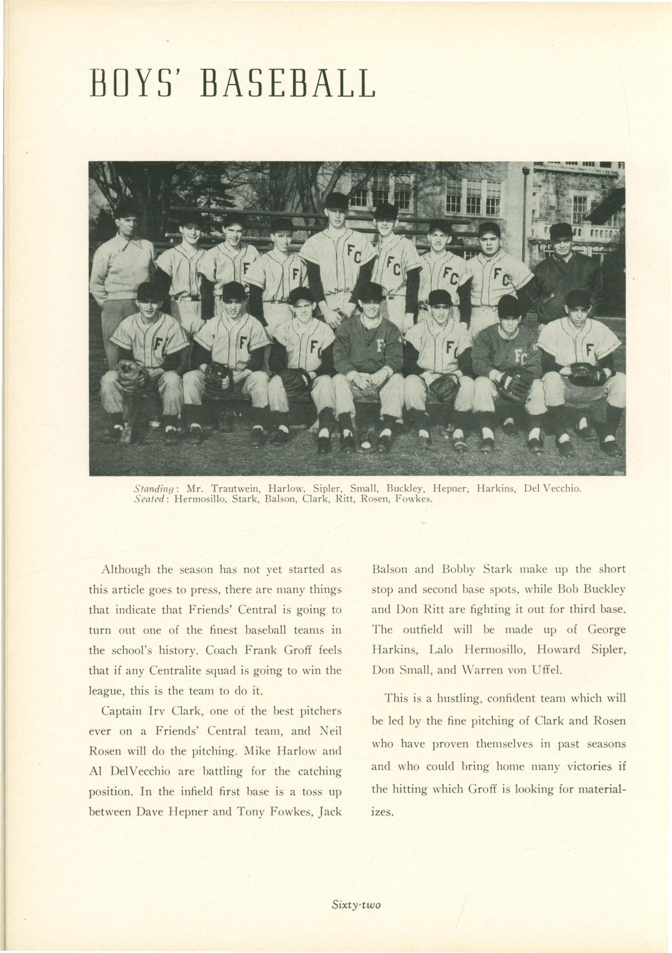 Although the season has not yet started a · this article goes to press. there are many things that indicate that Friends' Central is going to turn out one of the finest baseball teams in the school's history. Coach Frank Groff feels that if any Centralite squad is going to win the league, this is the team to do it.