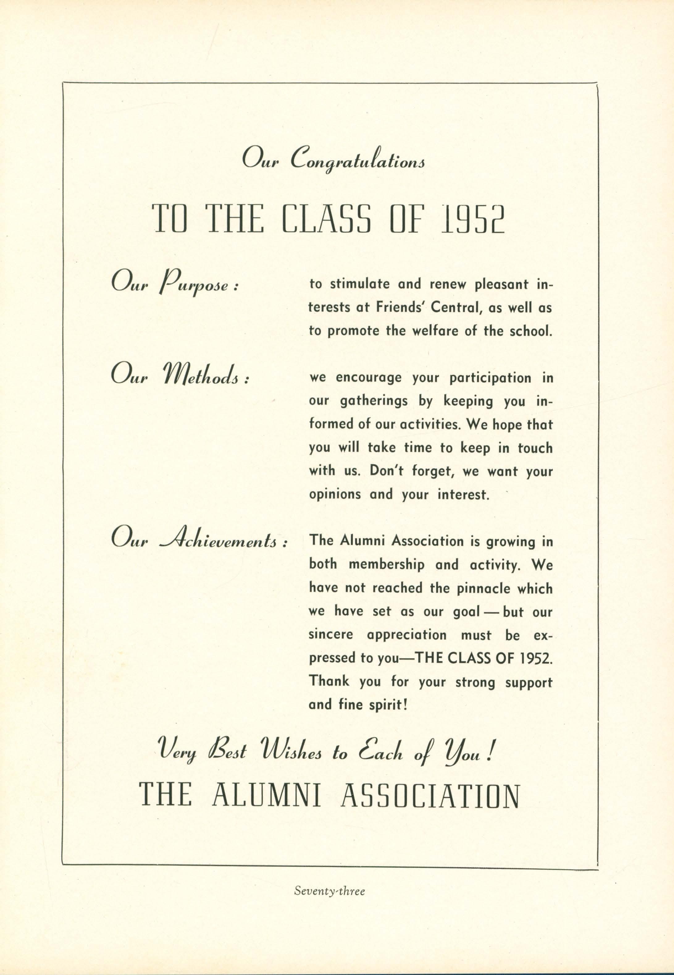 Our---4-chievemenla: The Alumni Association is growing in both membership and activity. We have not reached the pinnacle which we have set as our goal- but our sincere appreciation must be expressed to you-THE CLASS OF 1952. T:hank you for your strong support and fine spirit!