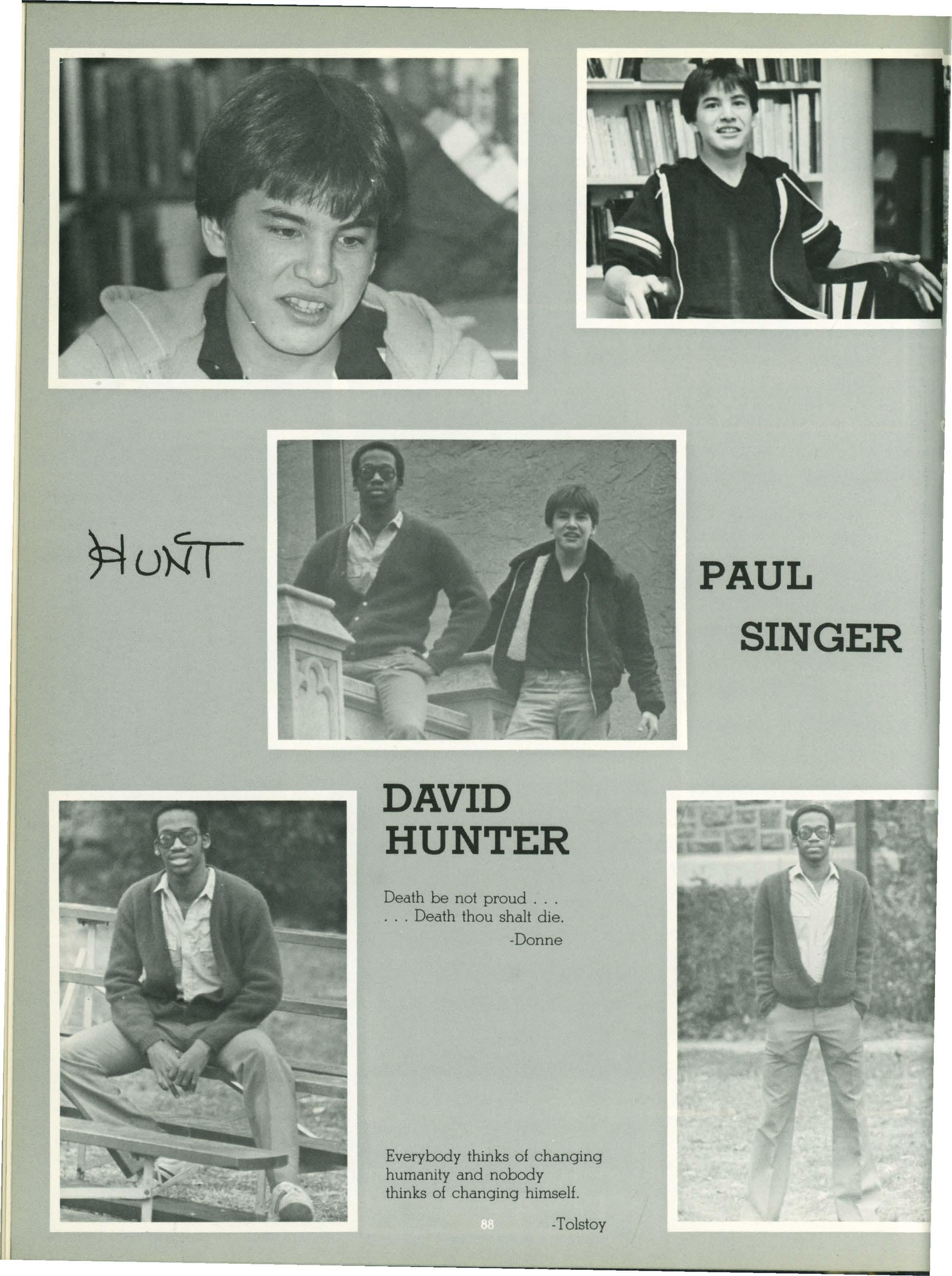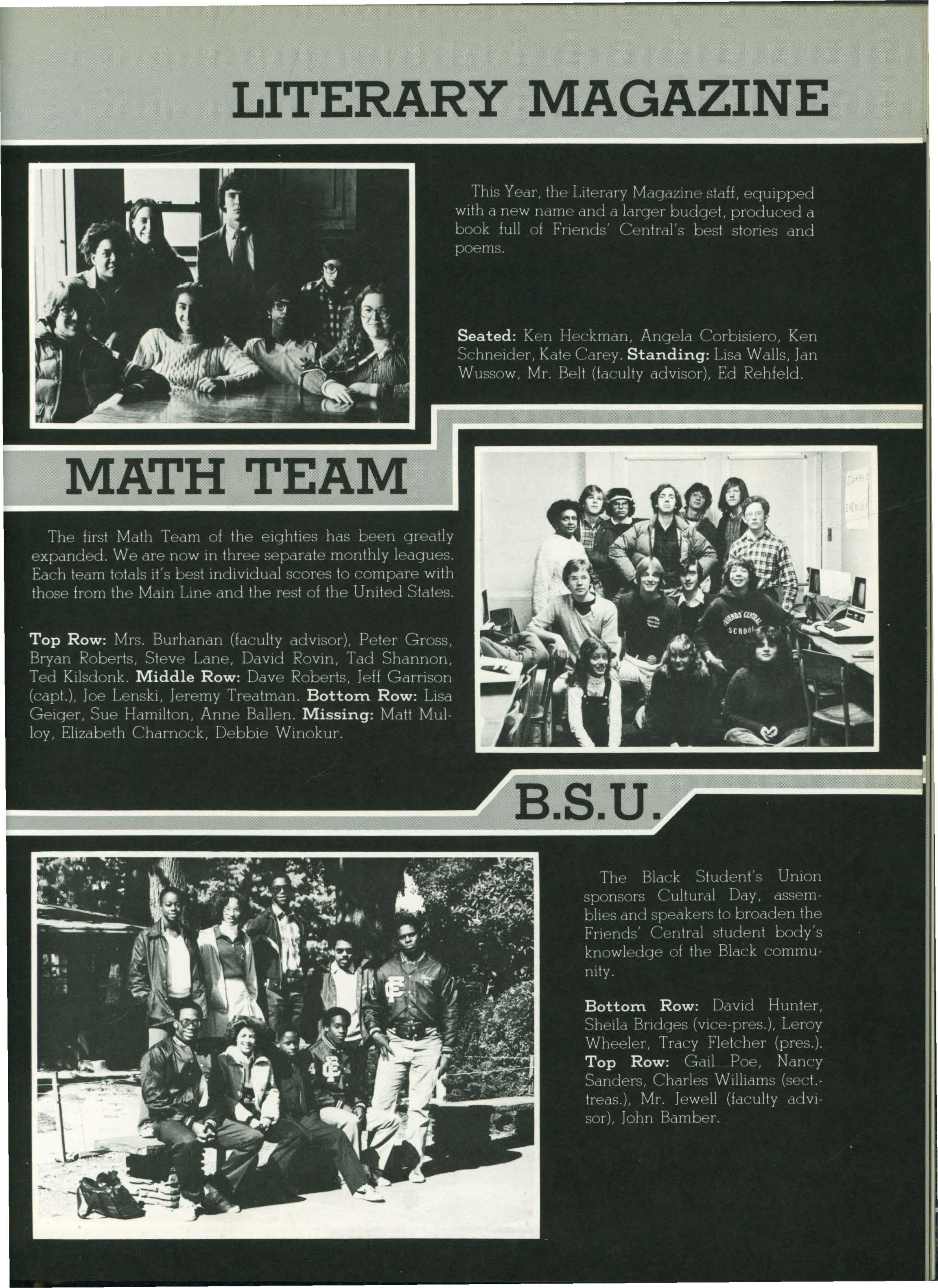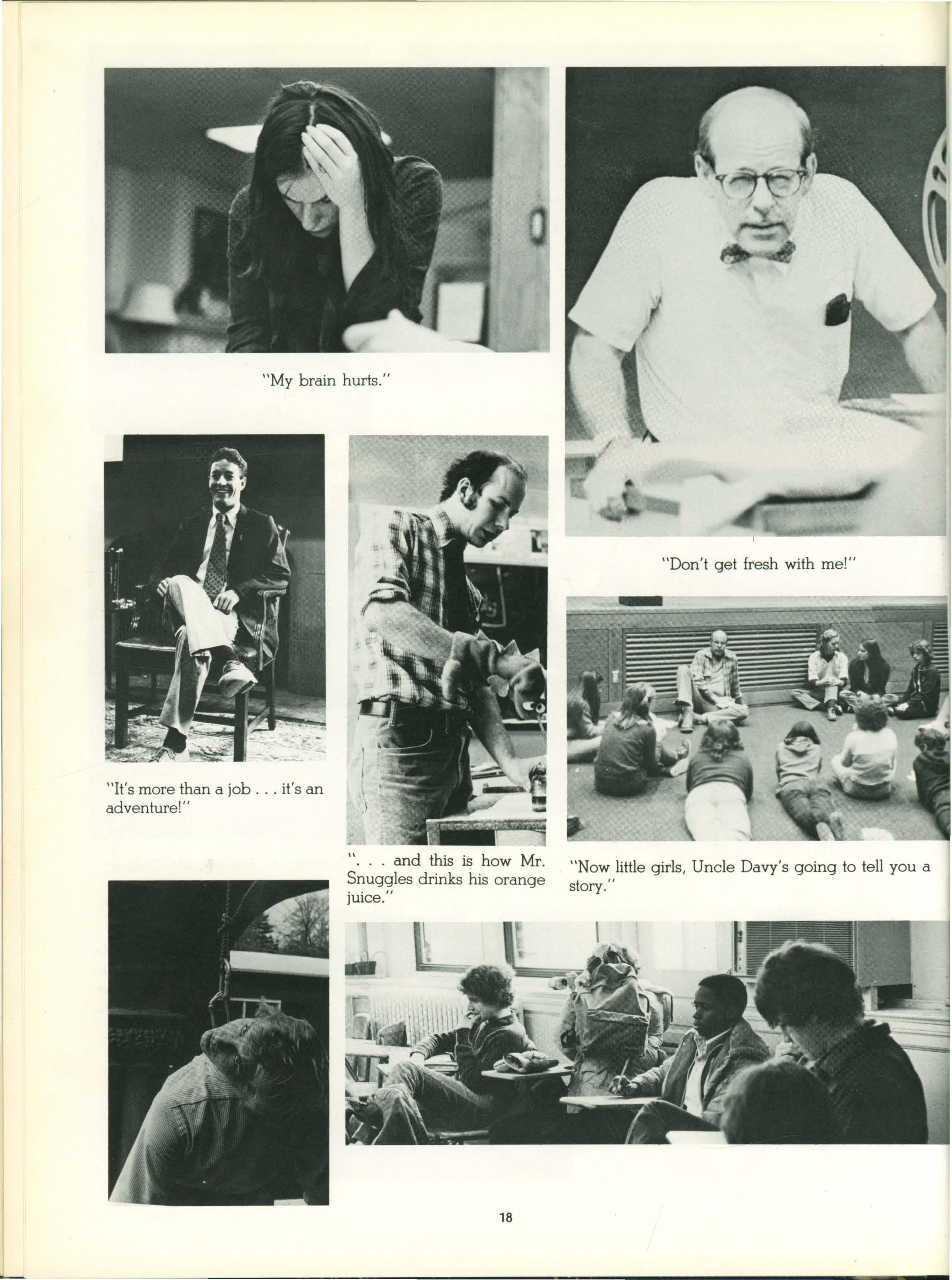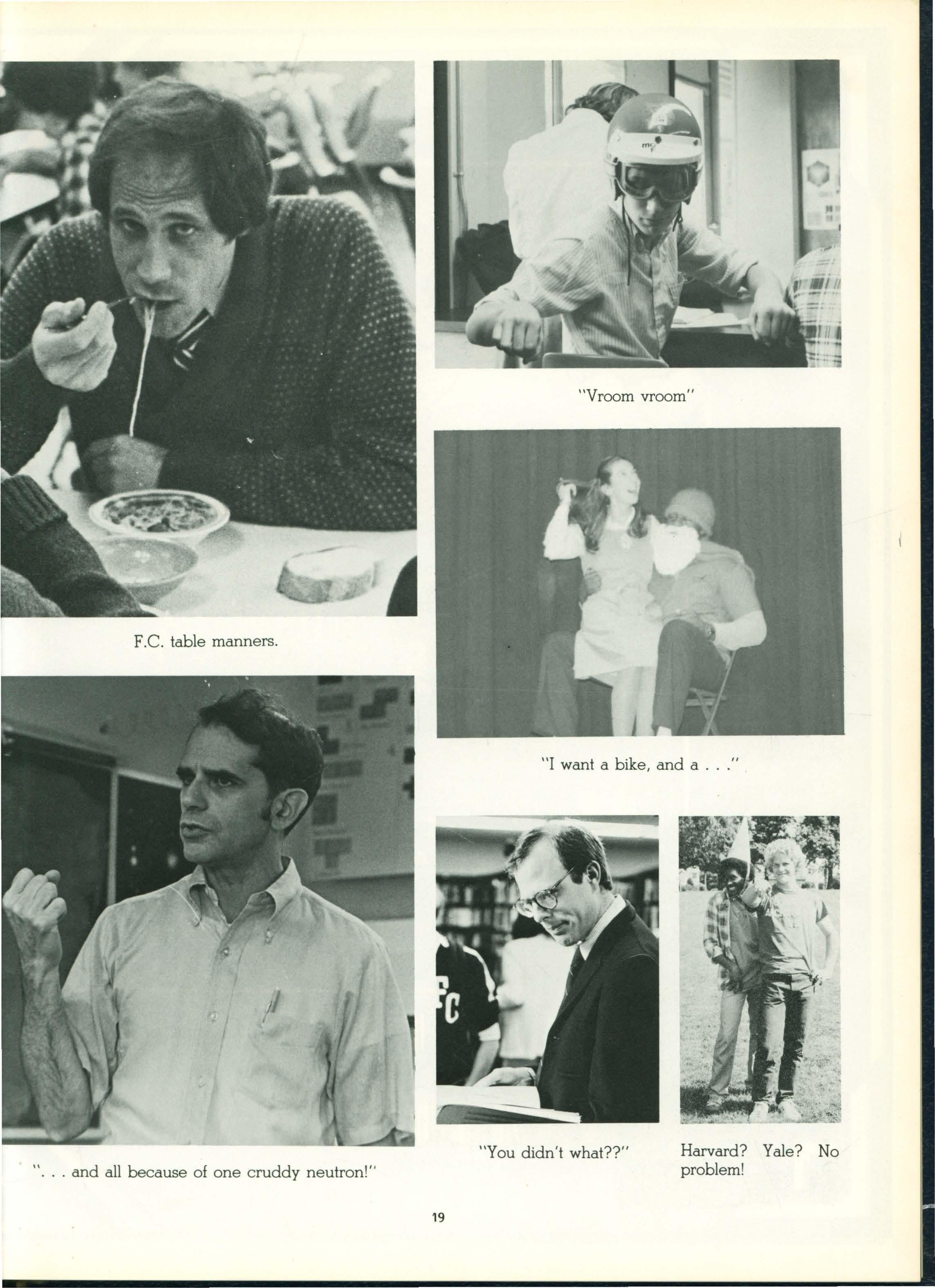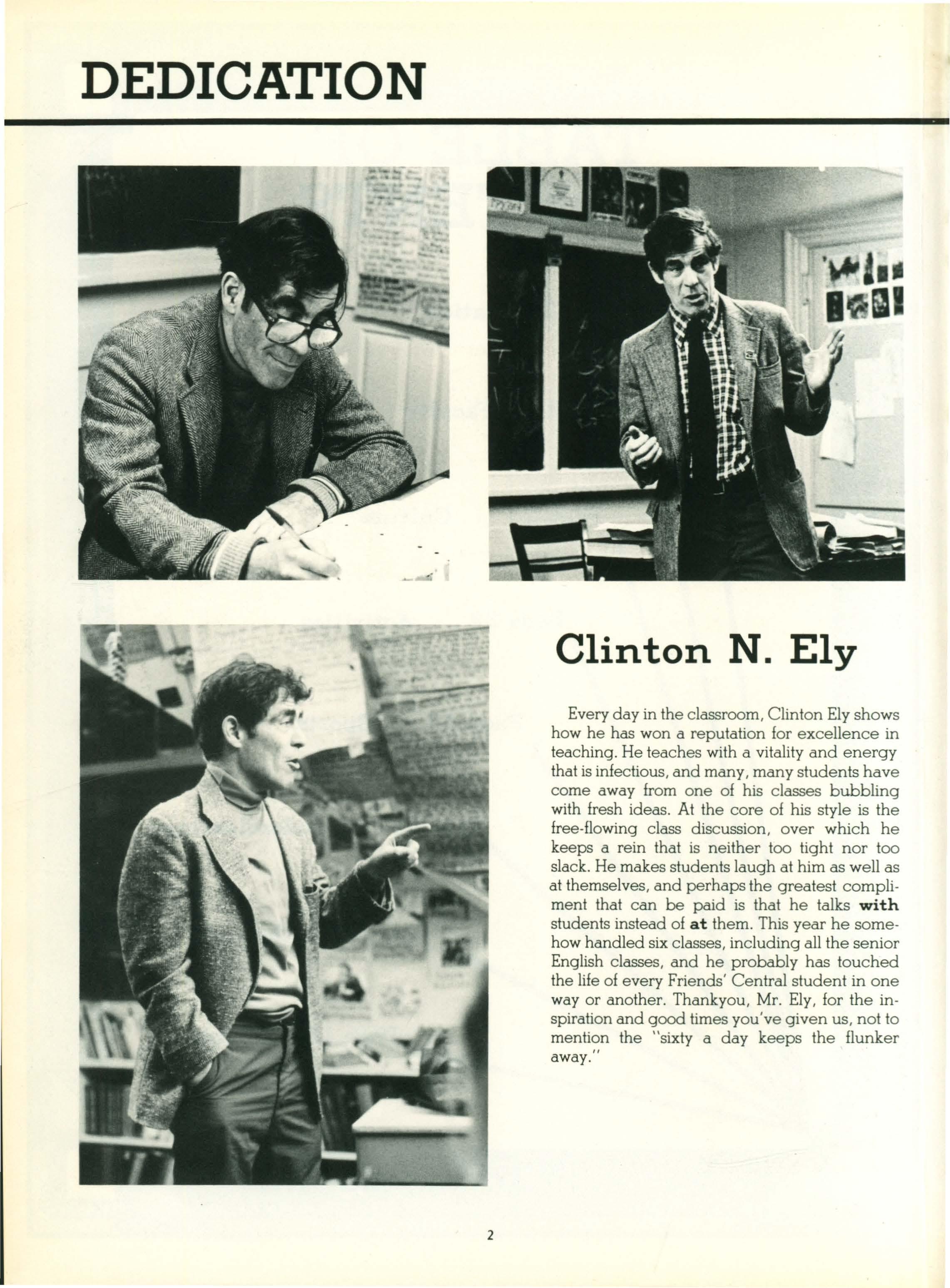 Every day in the classroom, Clinton Ely shows how he has won a reputation for excellence in teaching. He teaches with a vitality and energy that is infectious, and many, many students have come away from one of his classes bubbling with fresh ideas. At the core of his style is the free-flowing class discussion, over which he keeps a rein that is neither too tight nor too slack. He makes students laugh at him as well as at themselves , and perhaps the greatest compliment that can be paid is that he talks with students instead of at them. This year he somehow handled six classes, including all the senior English classes, and he probably has touched the life of every Friends' Central student in one way or another. Thankyou, Mr. Ely, for the inspiration and good times you've given us, not to mention the "sixty a day keeps the flunker away."