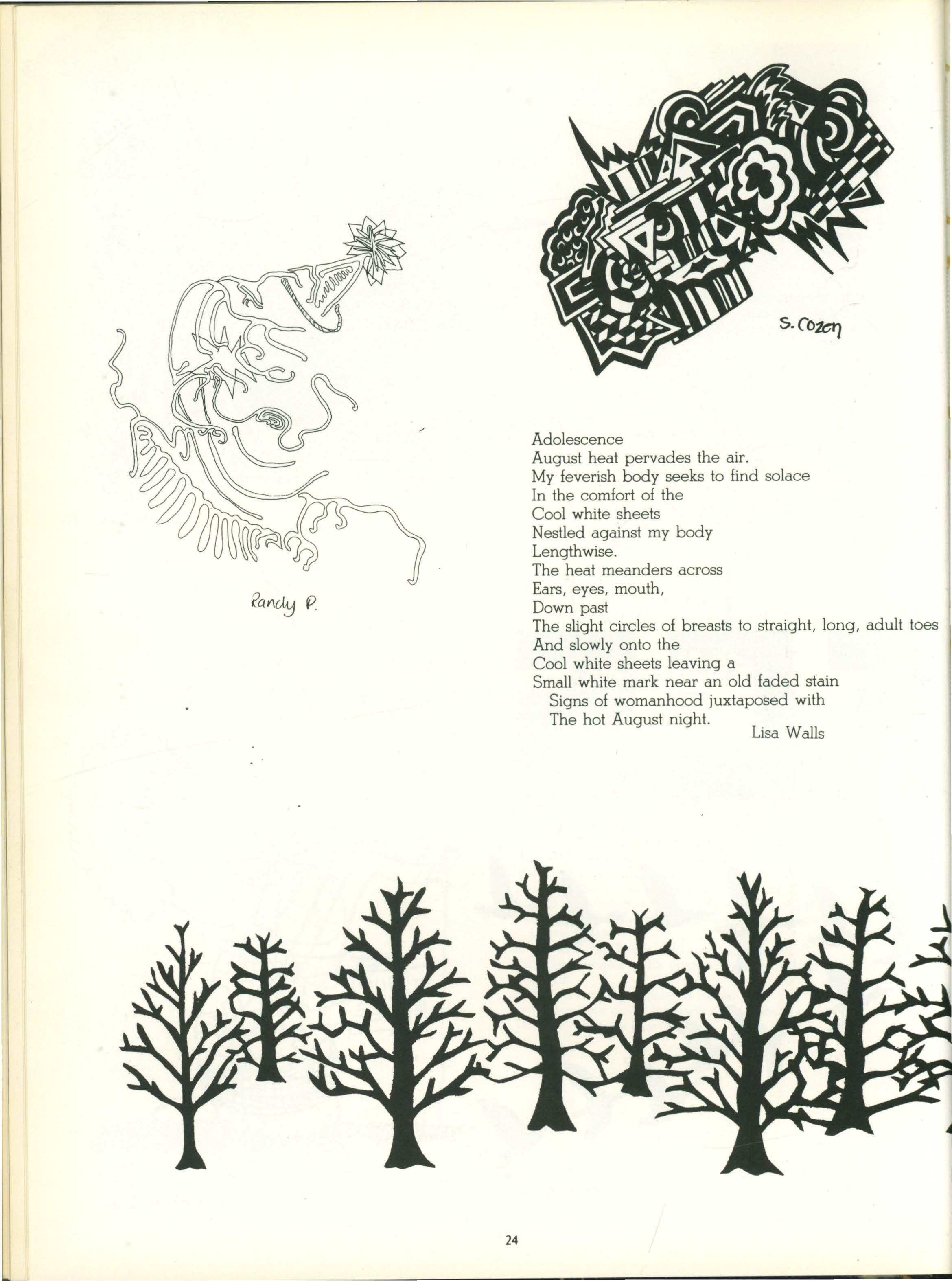 The slight circles of breasts to straight, long, adult toes And slowly onto the Cool white sheets leaving a Small white mark near an old faded stain Signs of womanhood juxtaposed with The hot August night.