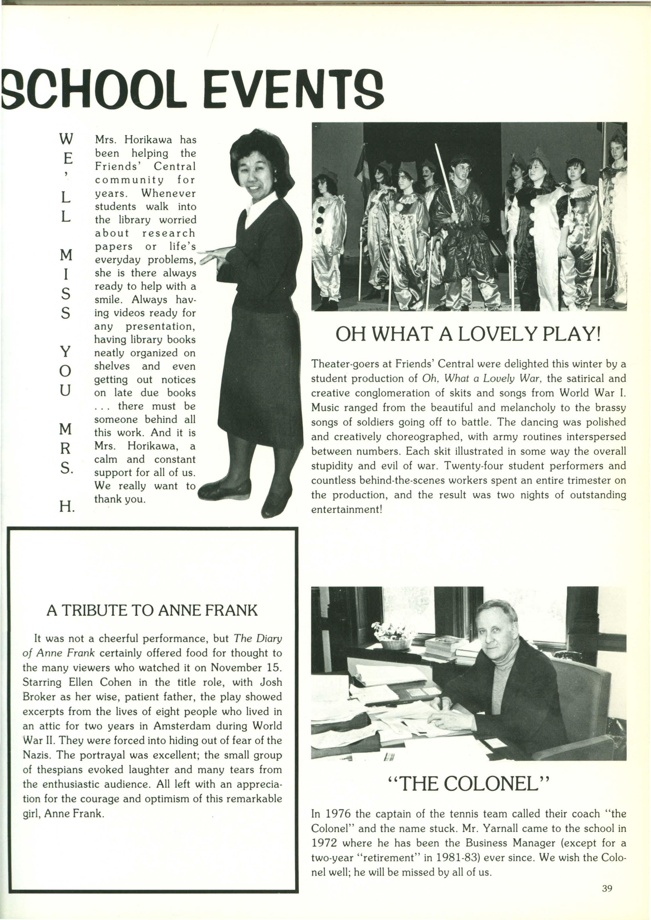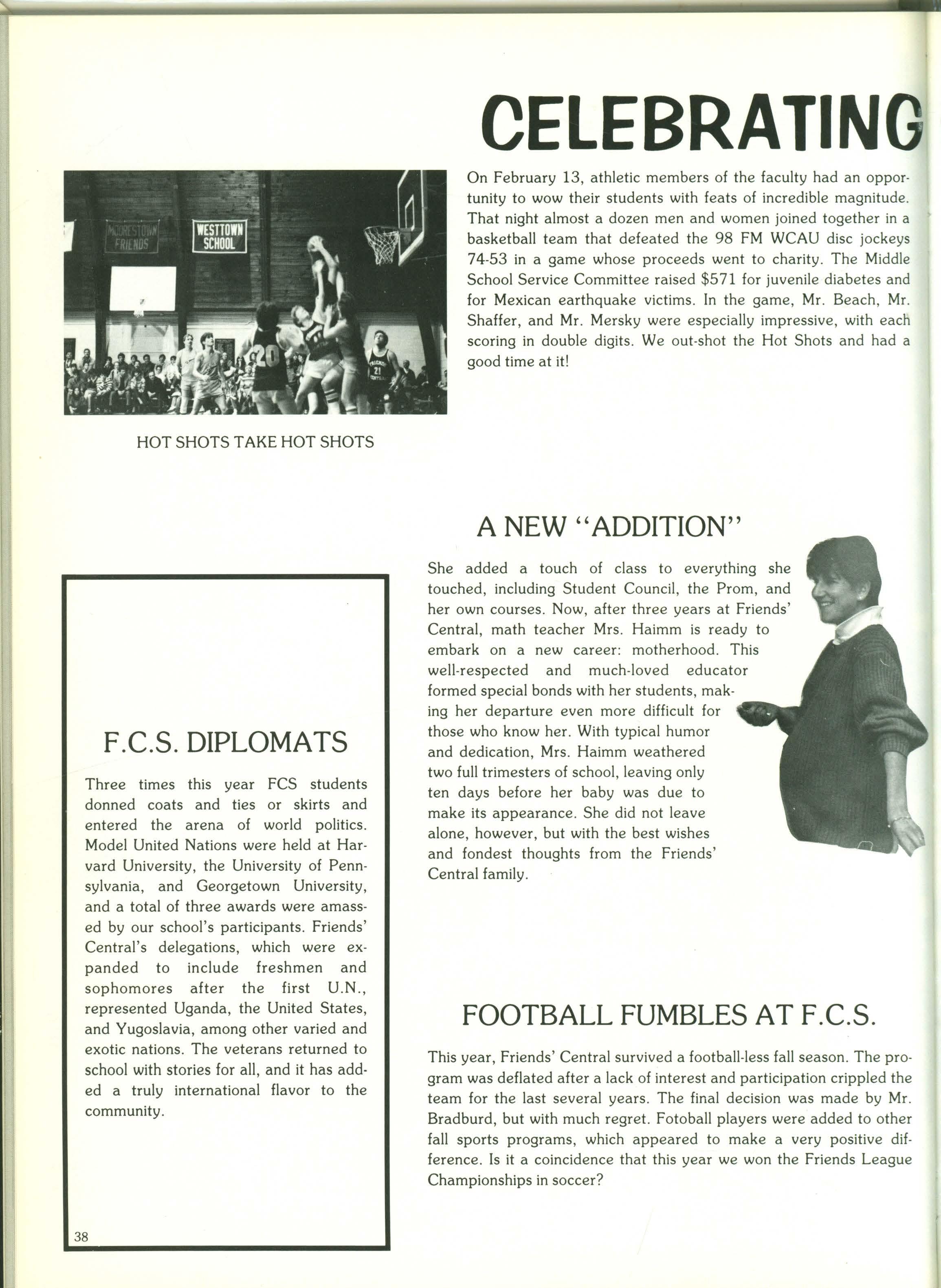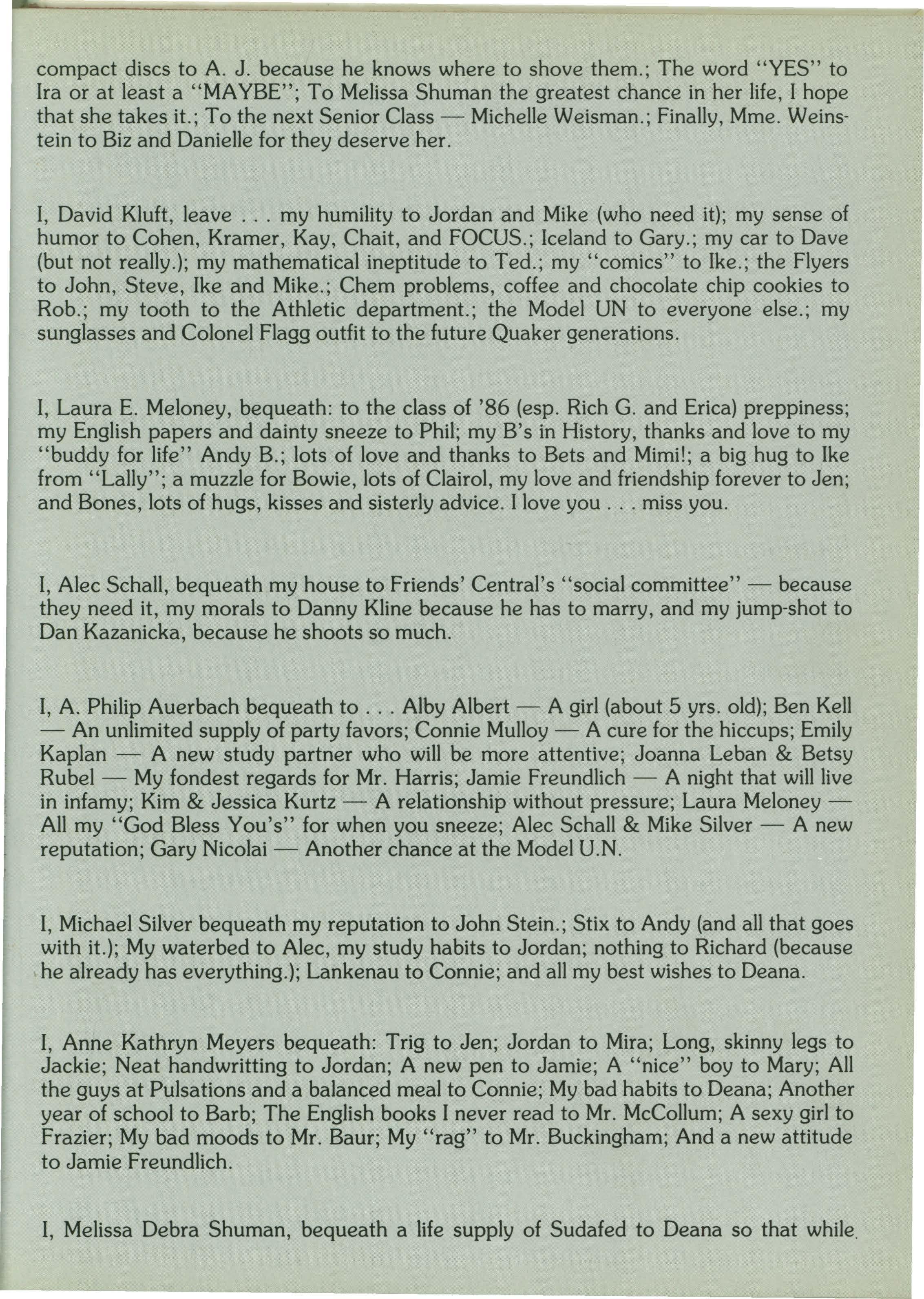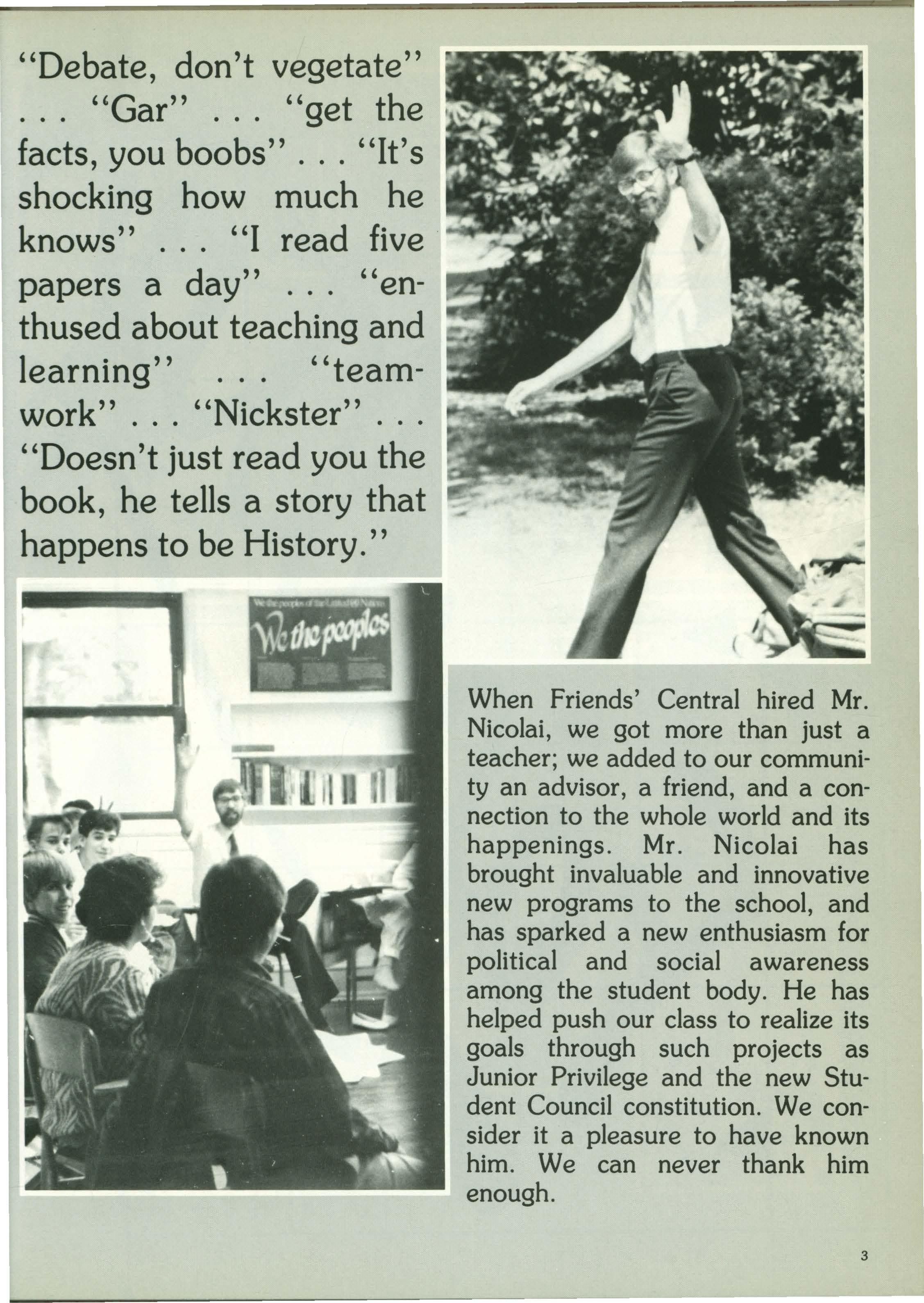 When Friends' Central hired Mr. Nicolai, we got more than just a teacher; we added to our community an advisor, a friend, and a connection to the whole world and its happenings. Mr. Nicolai has brought invaluable and innovative new programs to the school, and has sparked a new enthusiasm for political and social awareness among the student body. He has helped push our class to realize its goals through such projects as Junior Privilege and the new Student Council constitution. We consider it a pleasure to have known him. We can never thank him enough.