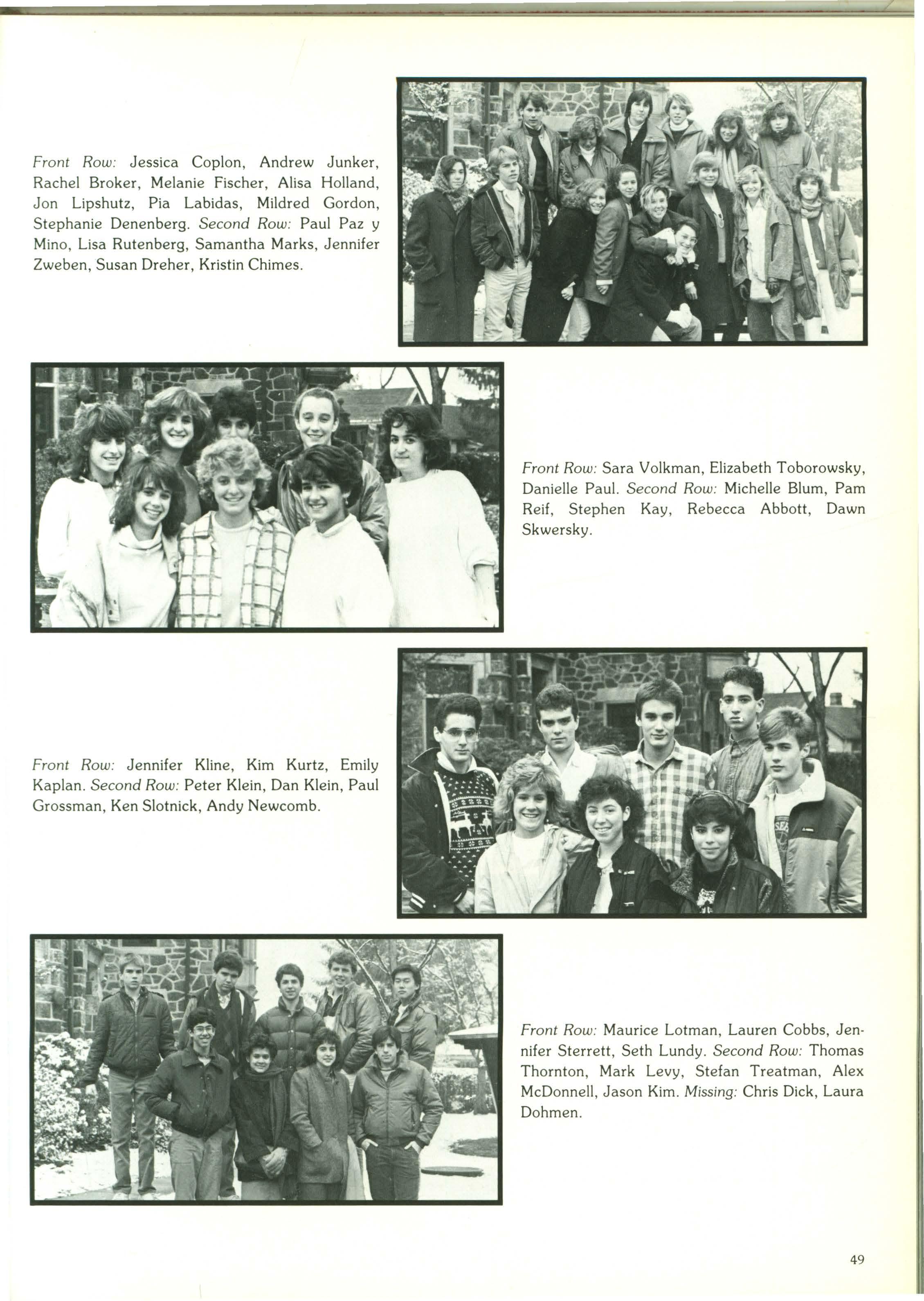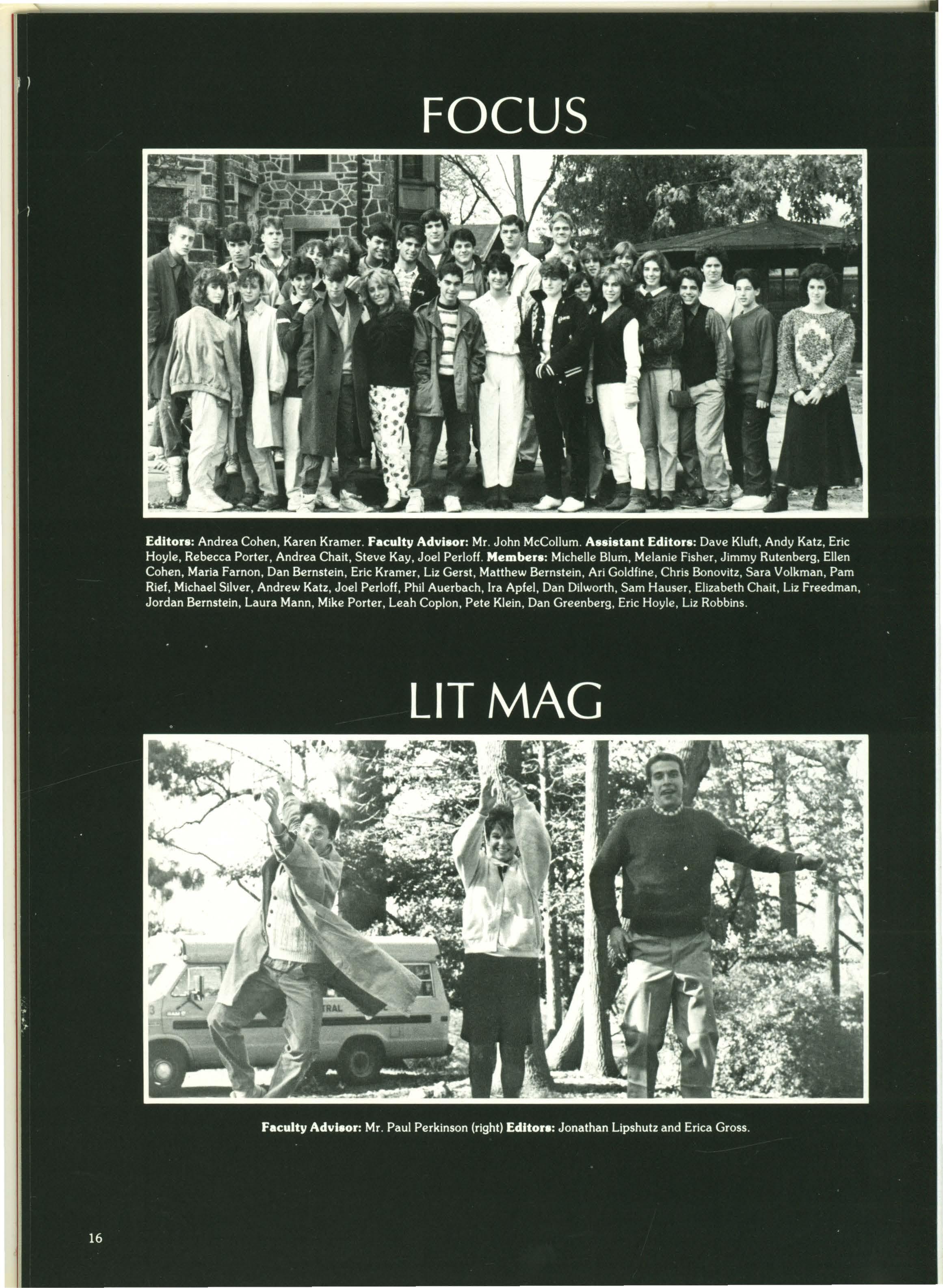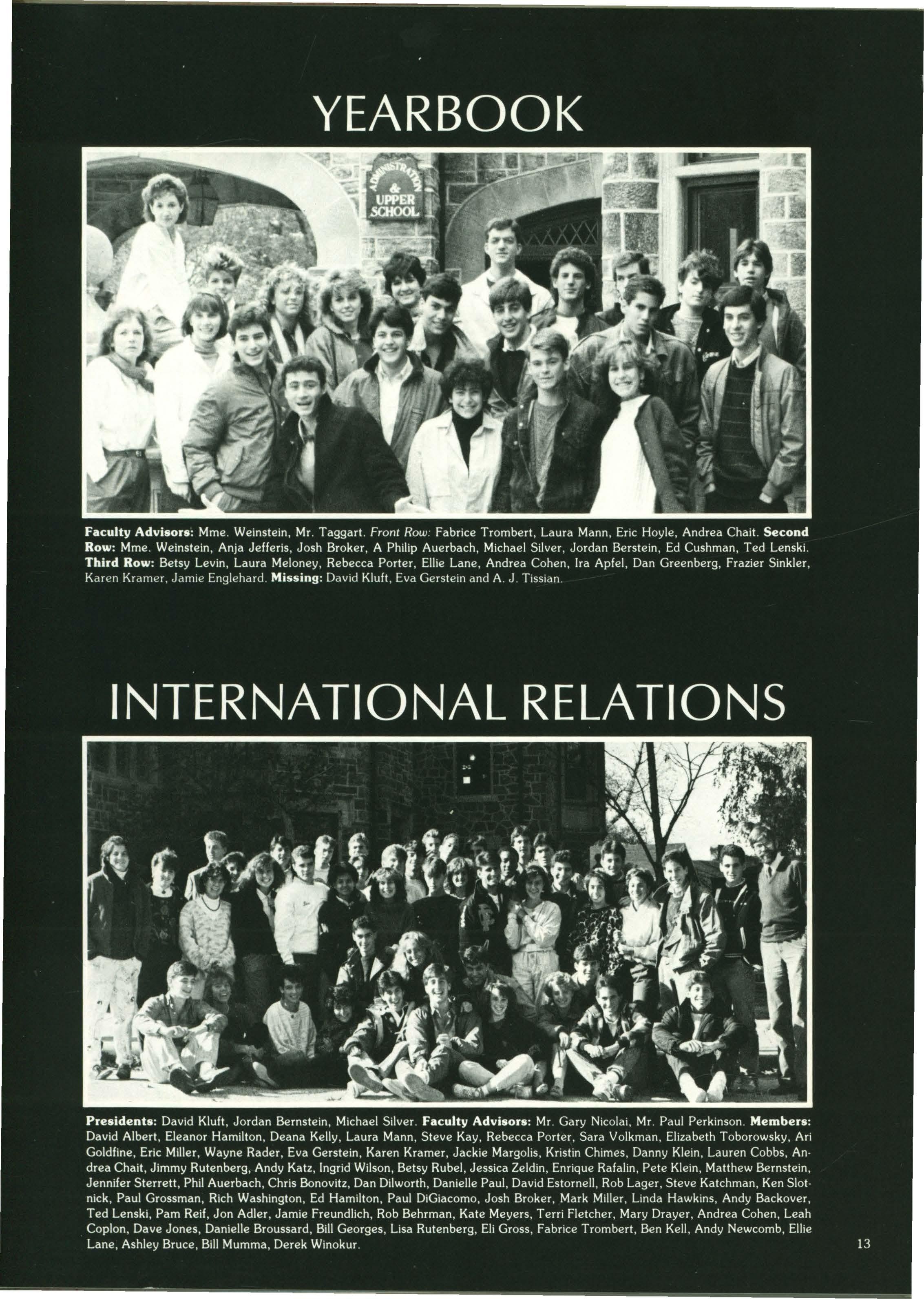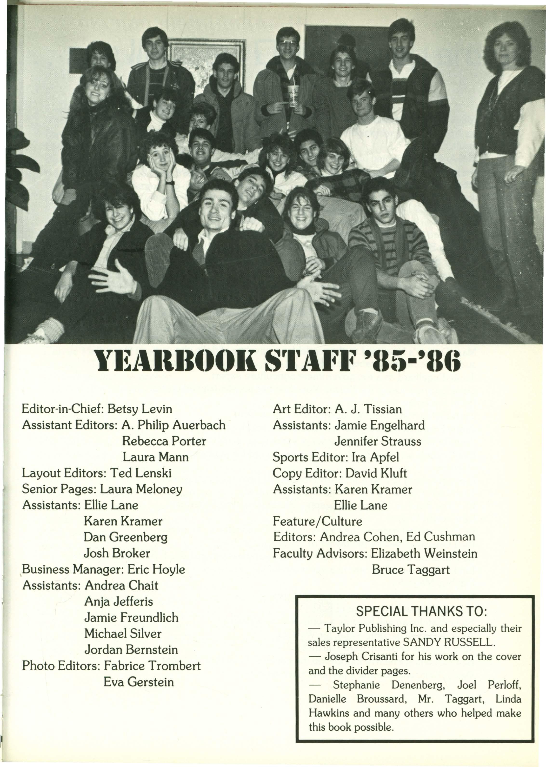 Editors: Andrea Cohen, Karen Kramer. Faculty Advisor: Mr. John McCollum. Assistant Editors: Dave Kluft, Andy Katz, Eric Hoyle, Rebecca Porter, Andrea Chait, Steve Kay, Joel Perloff. Members: Michelle Blum, Melanie Fisher, Jimmy Rutenberg, Ellen Cohen, Maria Farnon, Dan Bernstein, Eric Kramer, Liz Gerst, Matthew Bernstein, Ari Goldfine, Chris Bonovitz, Sara Volkman, Pam Rief, Michael Silver, Andrew Katz, Joel Perloff, Phil Auerbach, Ira Apfel, Dan Dilworth, Sam Hauser, Elizabeth Chait, Liz Freedman, Jordan Bernstein, Laura Mann, Mike Porter, Leah Coplon, Pete Klein, Dan Greenberg, Eric Hoyle, Liz Robbins.